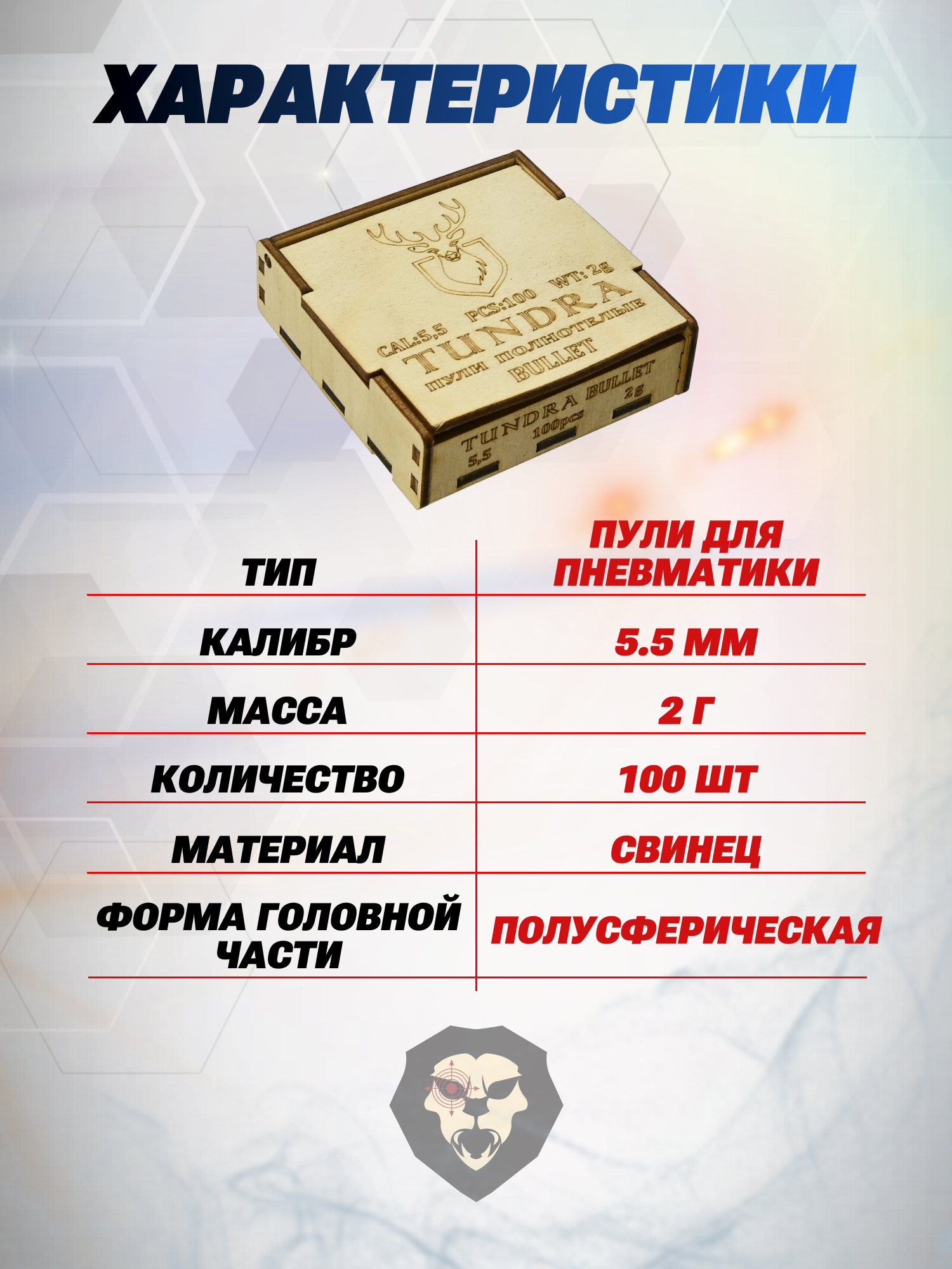 Информация о товаре "Пули пневматические Tundra Bullet 5.5 мм (100 шт, 2 г)" носит ознакомительный характер, и не является публичной офертой, определяемой положениями Статьи 437 Гражданского кодекса Российской Федерации, характеристики, внешний вид, цвет и комплектация могут быть изменены производителем без уведомления.