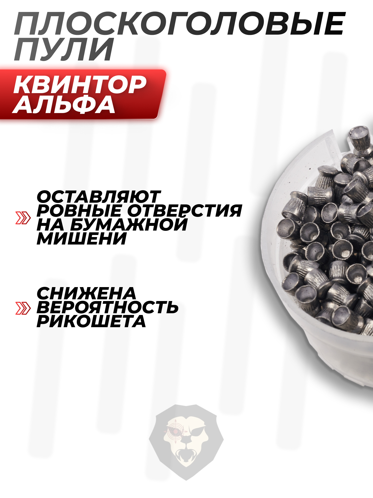 Пули Квинтор Альфа 4.5 мм имеют особенность в виде специальной конструкции, понижающей трение и стабилизирующей снаряд при движении по ствольной заготовке. Благодаря таким характеристикам пуля получает высокую начальную скорость и кучность. Вес боеприпаса 0.5 грамма.