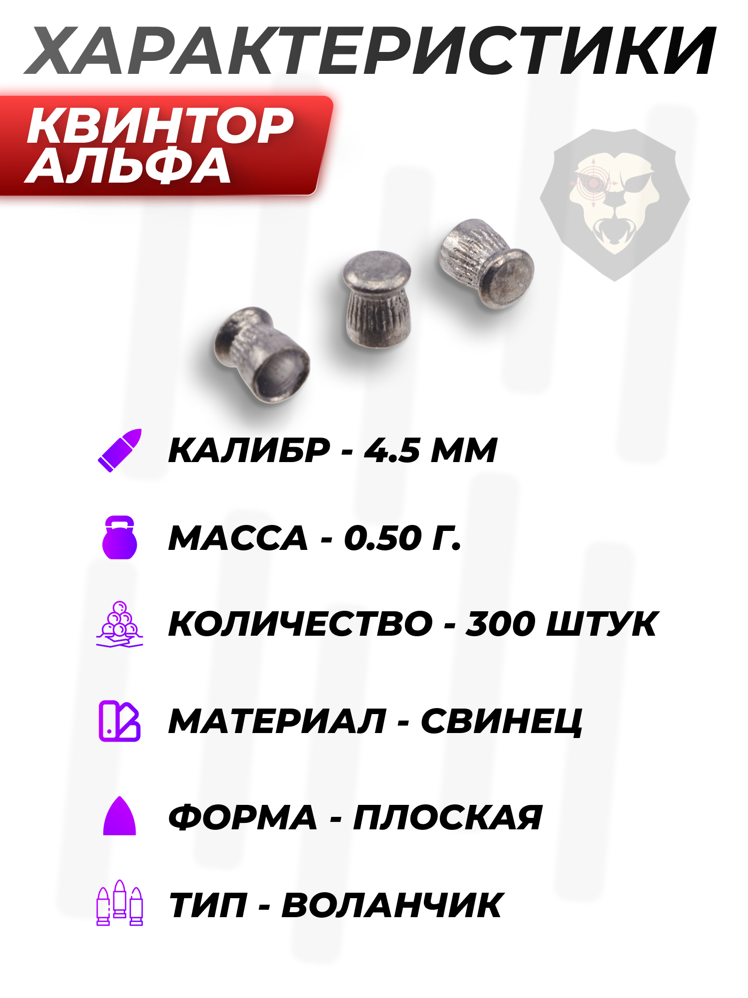 Представленные пульки Квинтор подойдут для спортивной и развлекательной стрельбы из мелкокалиберных воздушек 4.5 мм. Фронтальная часть снаряда представлена плоской формой, что обеспечивает ровные отметины на мишенях и отсутствие рикошетов при стрельбе такими боеприпасами. Рассматриваемые 0.50-граммовые пули изготавливаются из свинца, поэтому не повреждают стальные стволики пневматики, а на рынок снаряды Альфа поступают в пластиковых баночках по 300 шт.