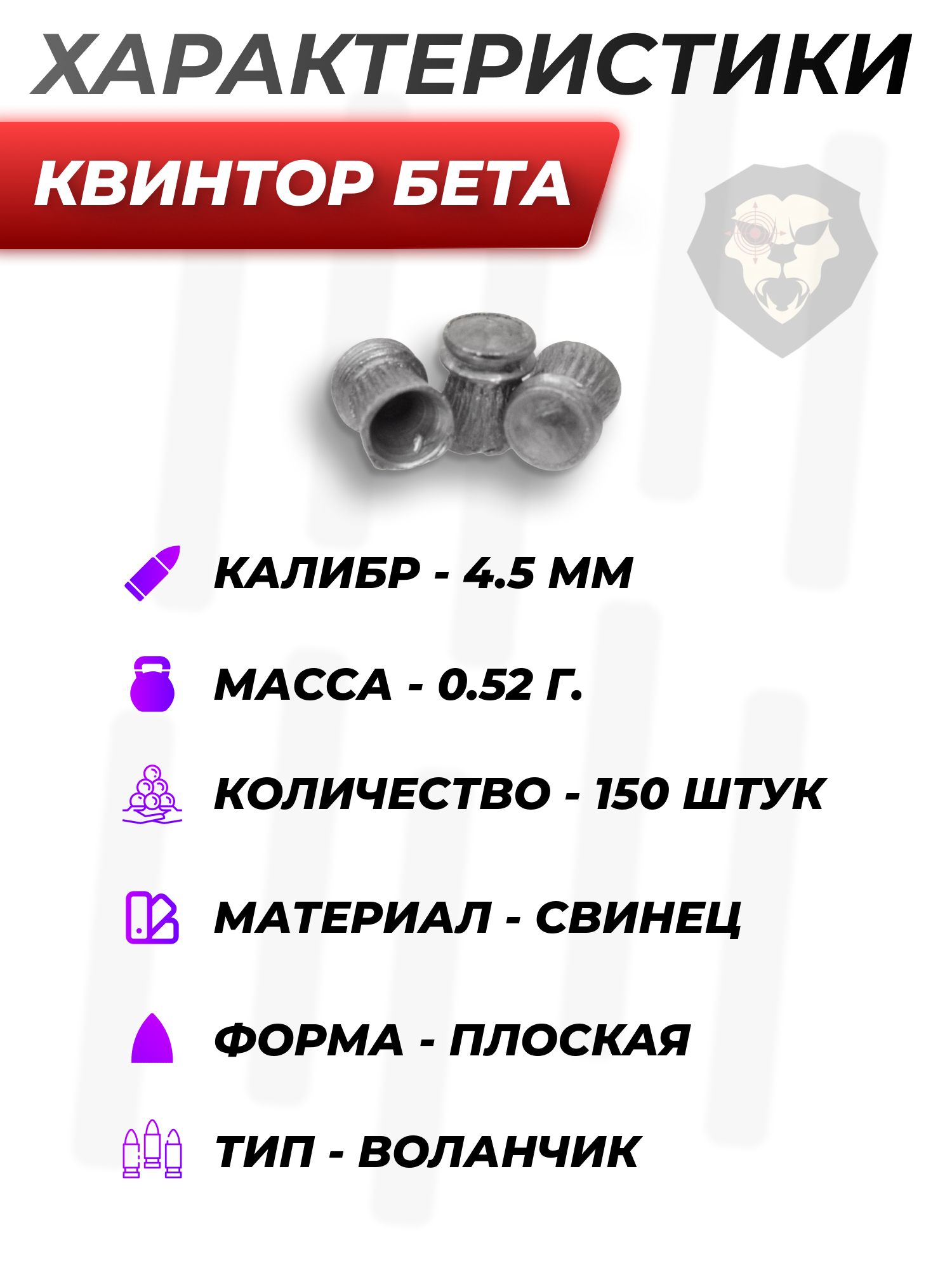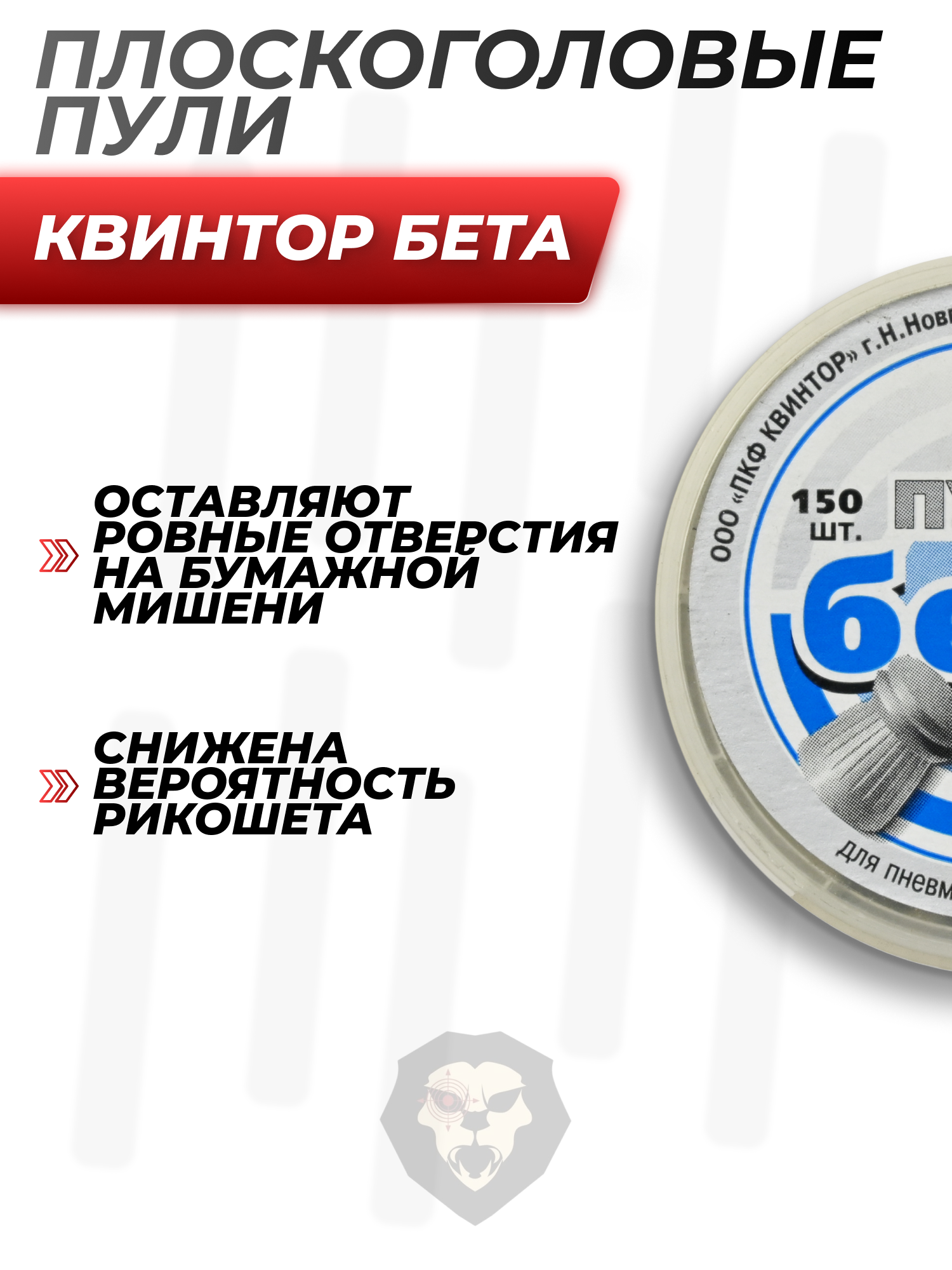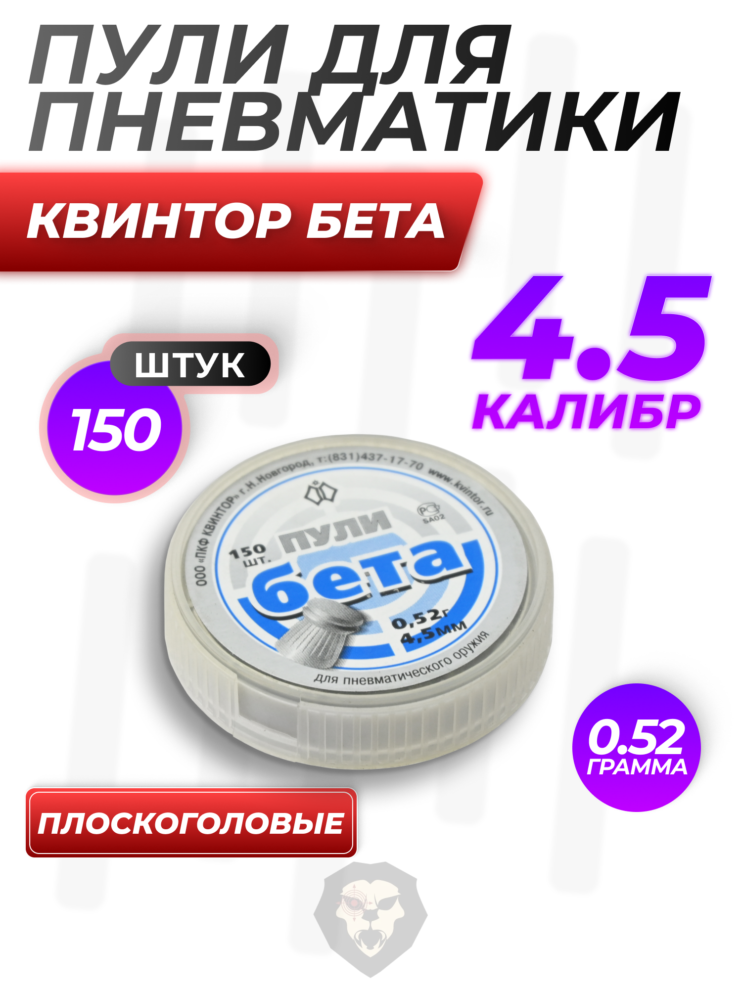 Представленные пульки для пневматики Квинтор располагают плоской головкой, на порядок снижающей вероятность рикошета боеприпаса. Этот снаряд из-за уникального строения отличается сбалансированным центром масс, что дает пуле повышенное начальное ускорение после выстрела и способствует увеличенной кучности стрельбы. Облегченные 0.52-граммовые пульки Квинтор применяются с мелкокалиберным пневматическим оружием 4.5 мм и на рынок поступают в пластиковых баночках, вмещающих по 150 боеприпасов.