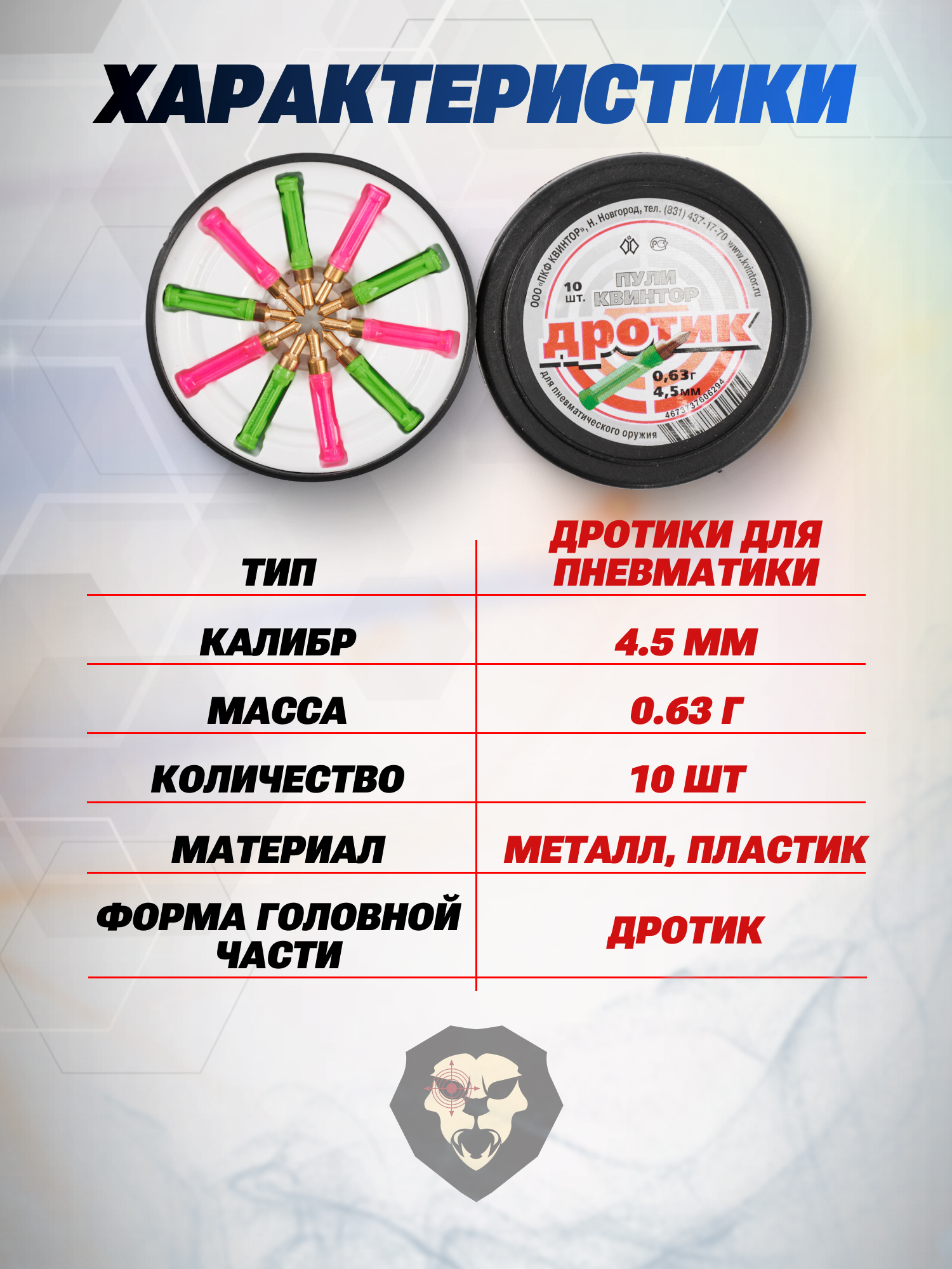 Боеприпас Квинтор Дротик исполнен в калибре 4.5 миллиметров из полимера с остроконечной головной частью из стали и массой 0.63 грамма. Пластиковая часть пули Квинтор Дротик изготовлена в цвете для более четкого определения места попадания в мишень. Поставляется на рынок с полимерными хвостовиками в двух цветах, розовом и зеленом, позволяя использовать такой тип боеприпасов сразу двум стрелкам.