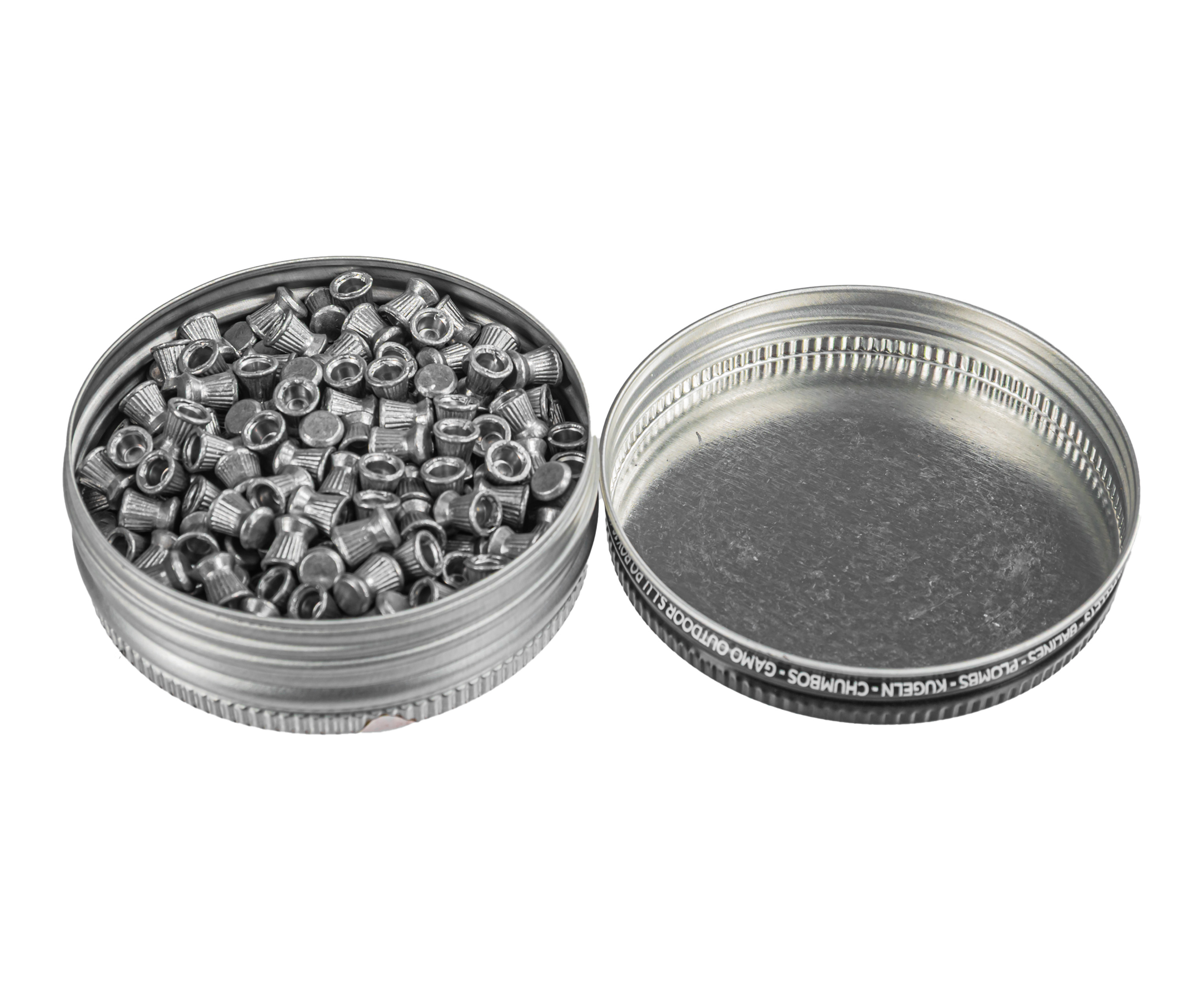 Пневматические пули Gamo Match 5.5 мм уложили в стандартную баночку, изготовленную из металла - ее допускается носить в кармане ввиду небольших размеров. При этом предусмотрена крышка, чтобы исключить выпадение снарядов. Указанная тара в представленном варианте предусматривает 250 единиц.