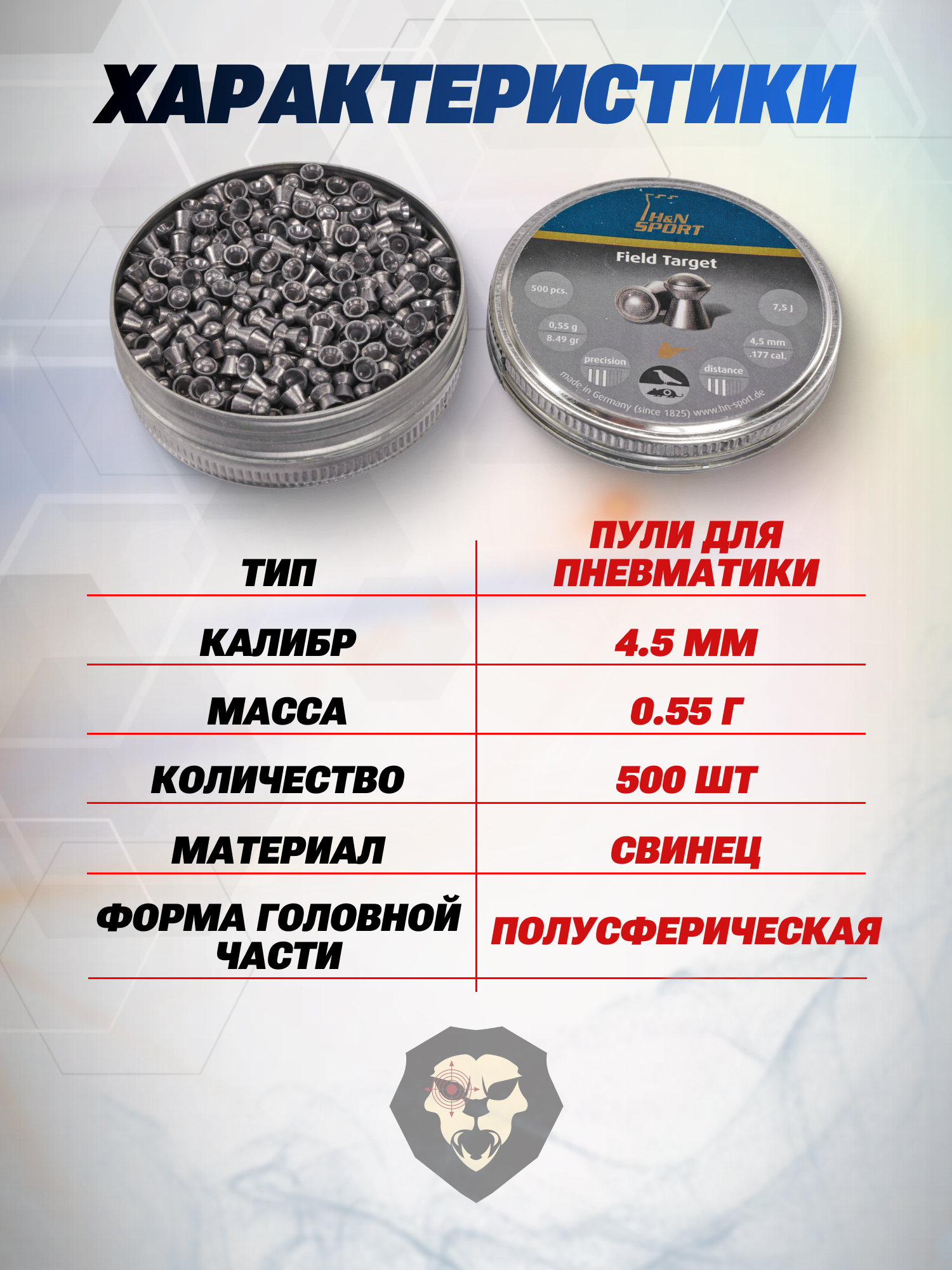 Обозреваемые пули в представленном варианте исполнили под калибр 4.5 миллиметра. Особенностью образцов является их полусферическая форма головной части - за счет такого решения снаряды способны сохранять кинетическую энергию после выстрела, ввиду чего отмечается увеличенная дальность полета.