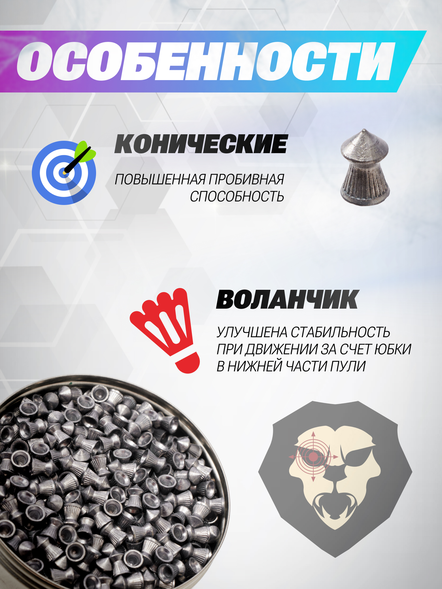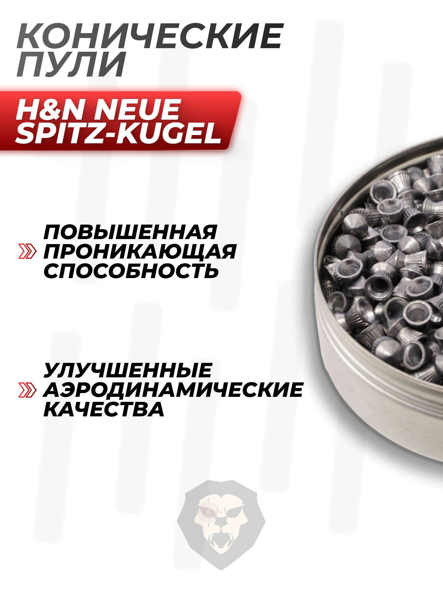 Обширный интерес представляют заряды с конической головкой, созданные для повышения пробивной способности - такой формат верхней части способствует уменьшению сопротивления воздуха. Товарный ряд предприятия представил рассматриваемые образцы калибра 5.5 миллиметра с такой концепцией. Для изготовления использовался свинец.