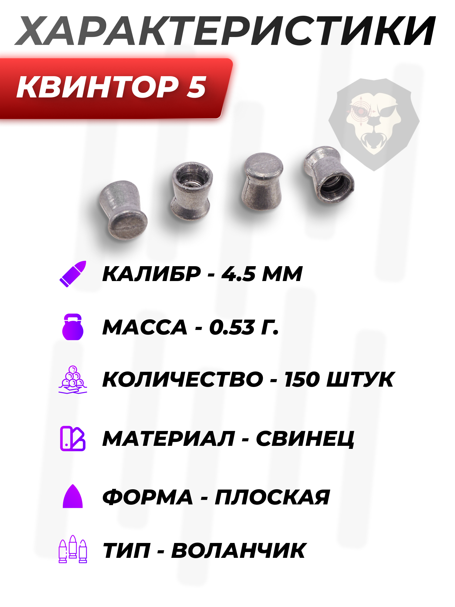Характеристики пневматических пуль Квинтор 5 4.5 мм (150 шт, 0.53 грамма, wadcutter)