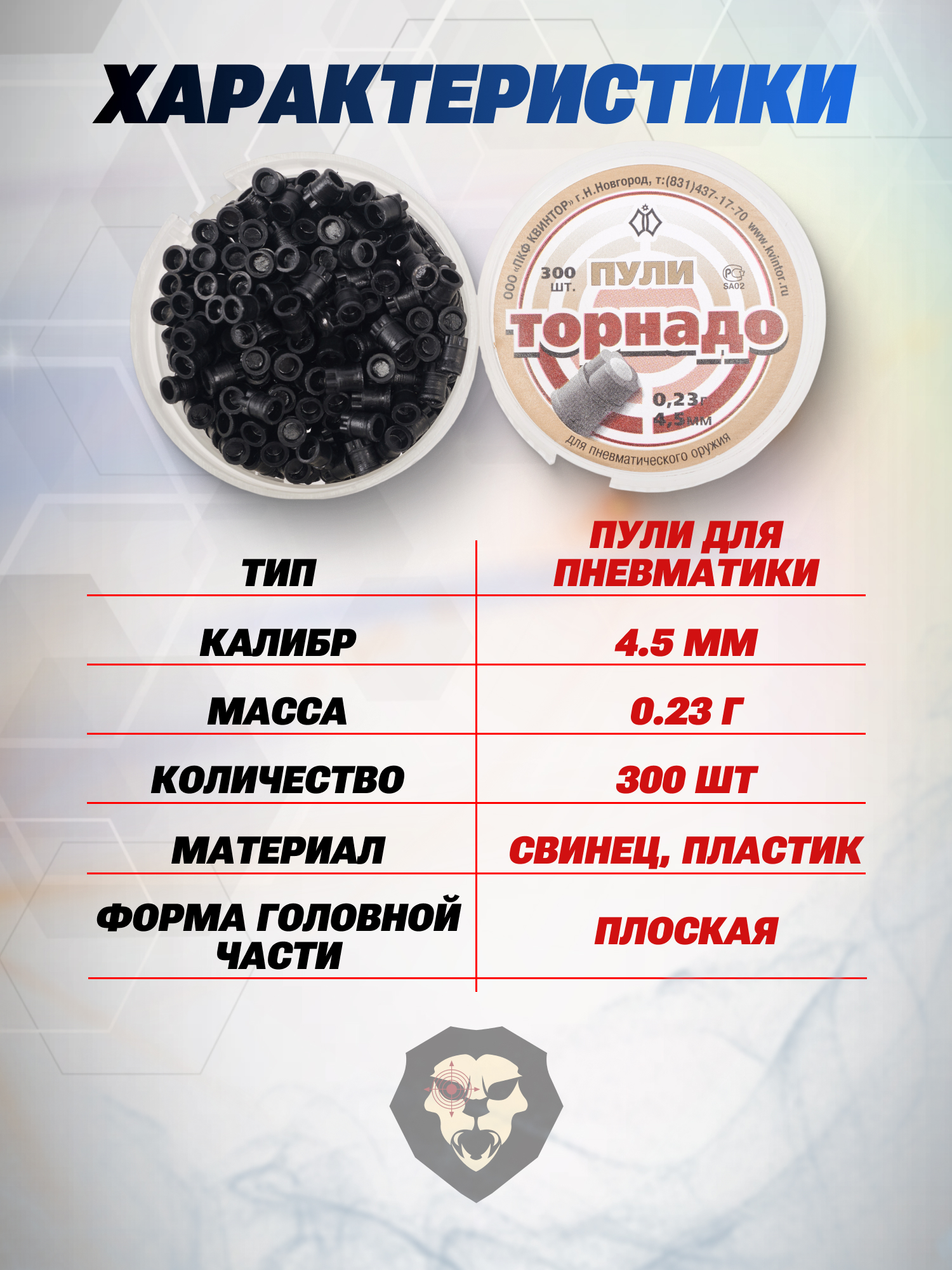 Представленные снаряды отличаются особой конструкцией, в основе которой лежит свинцовый сердечник, окруженный пластиковым контейнером-обтюратором. Такое строение боеприпаса Квинтор — причина его разрушения при попадании по цели, благодаря чему снижена вероятность рикошета пульки. Также особенностями рассматриваемого образца пуль являются смещенный во фронтальную часть центр тяжести и обтюрация заднего сегмента для повышенной степени устойчивости пульки в полете. На рынок облегченные 0.23-граммовые снаряды Квинтор Торнадо поступают в пластиковых упаковках по 300 штук.