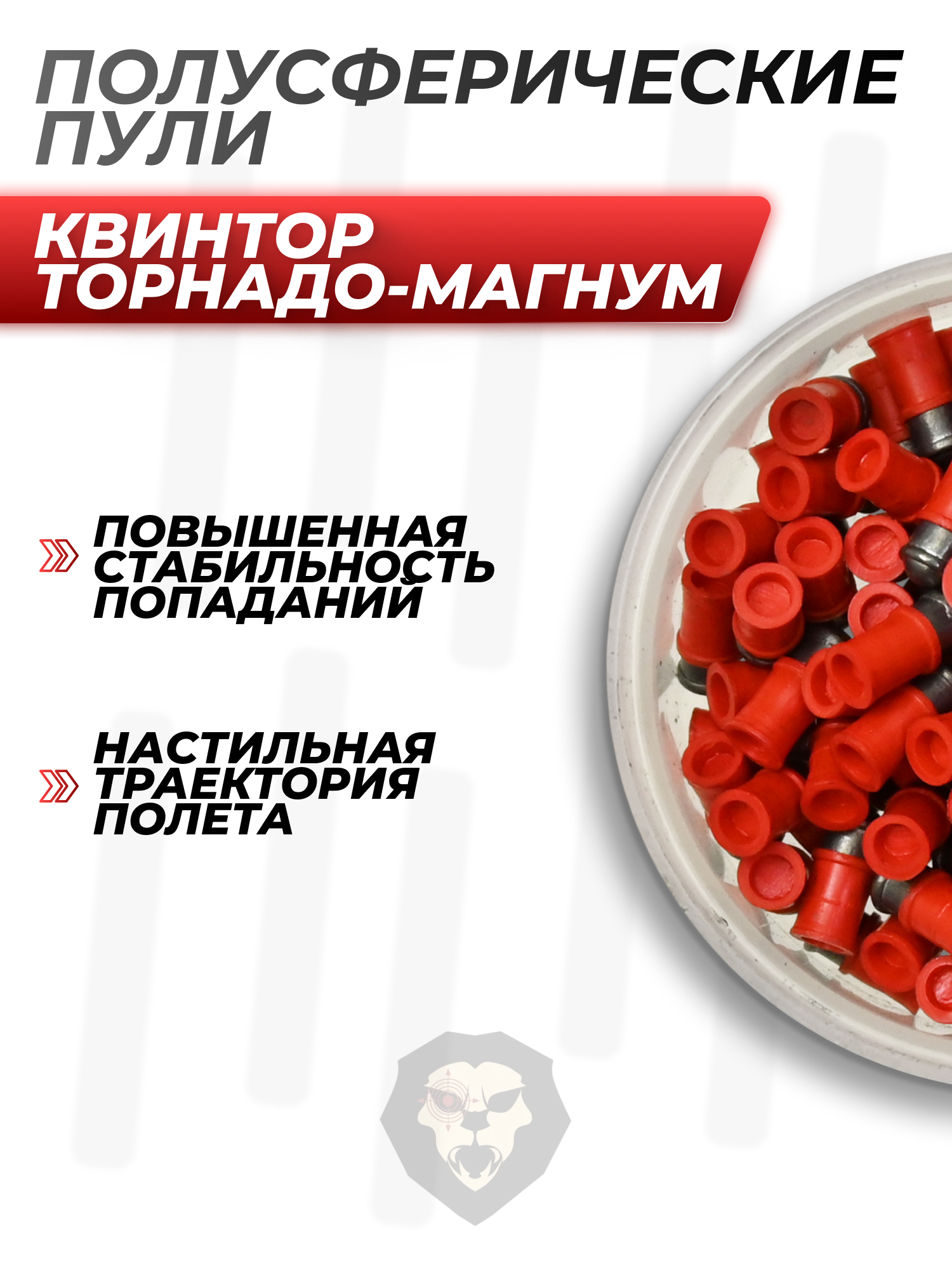 Одним из важнейших аспектов точной и кучной стрельбы считается подбор нужного вида пуль для винтовок пневматического типа. Компания Квинтор предоставляет для пользователей пневматики широкий выбор боеприпасов, для использования в спортивных, развлекательных или охотничьих целях. Пуля Квинтор Торнадо-Магнум относится к категории тяжёлых воланчиковых снарядов, который рекомендуется производителем использовать совместно с винтовками большой мощности.