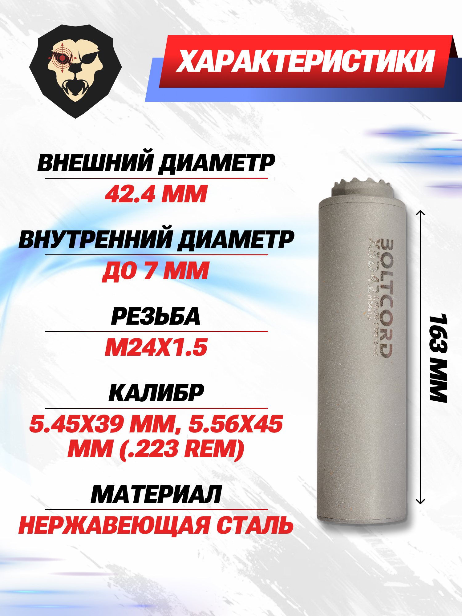 Образец BC D42 X5 предназначен для установки на оружие с российским стандартом резьбы - М24х1.5. Проходное отверстие модели рассчитано на калибры 5.45 и 5.56 миллиметров. Следует отметить, что дульный тормоз Болткорд подходит на армейское оружие - изделие допускает стрельбу очередями.