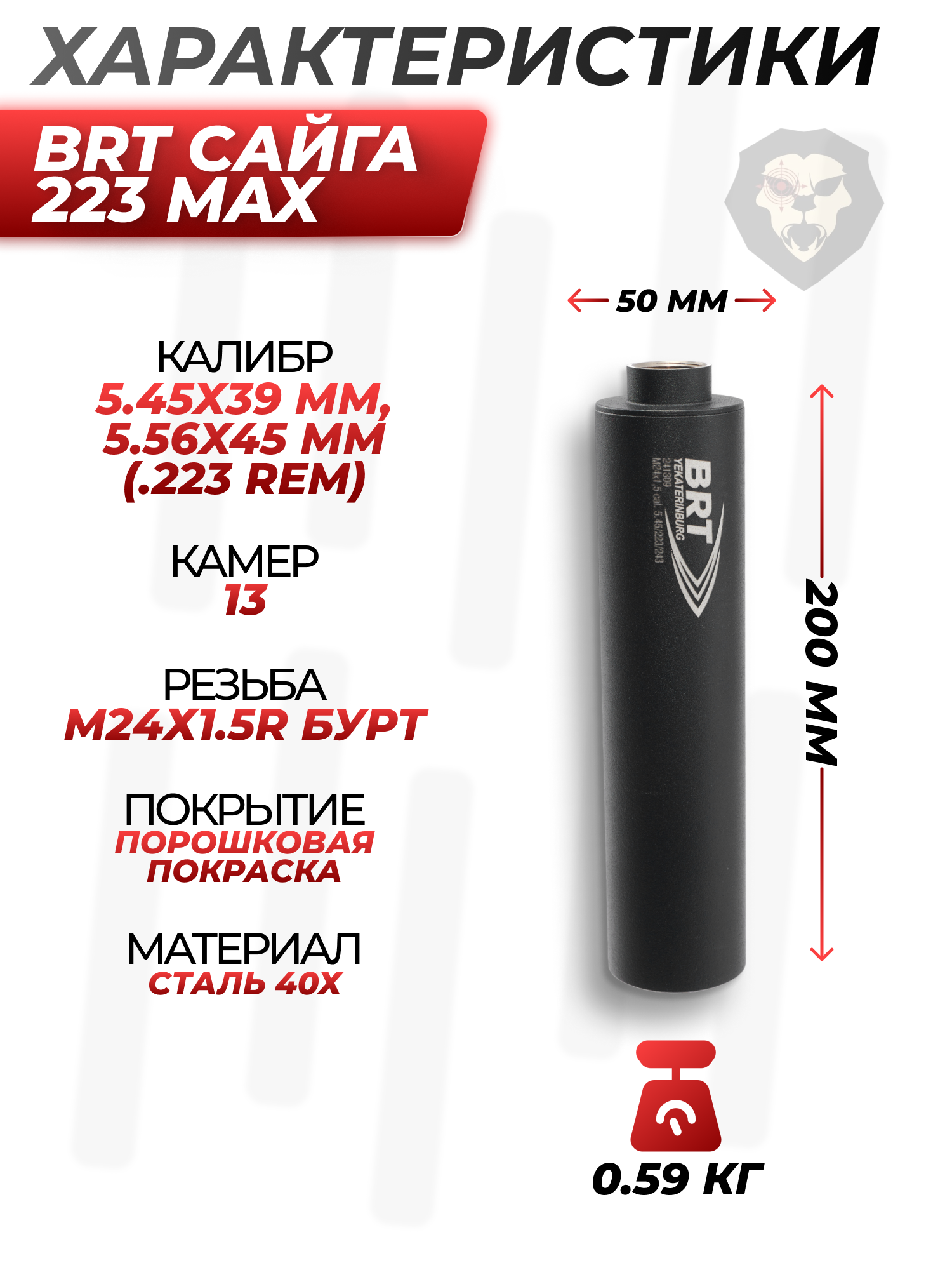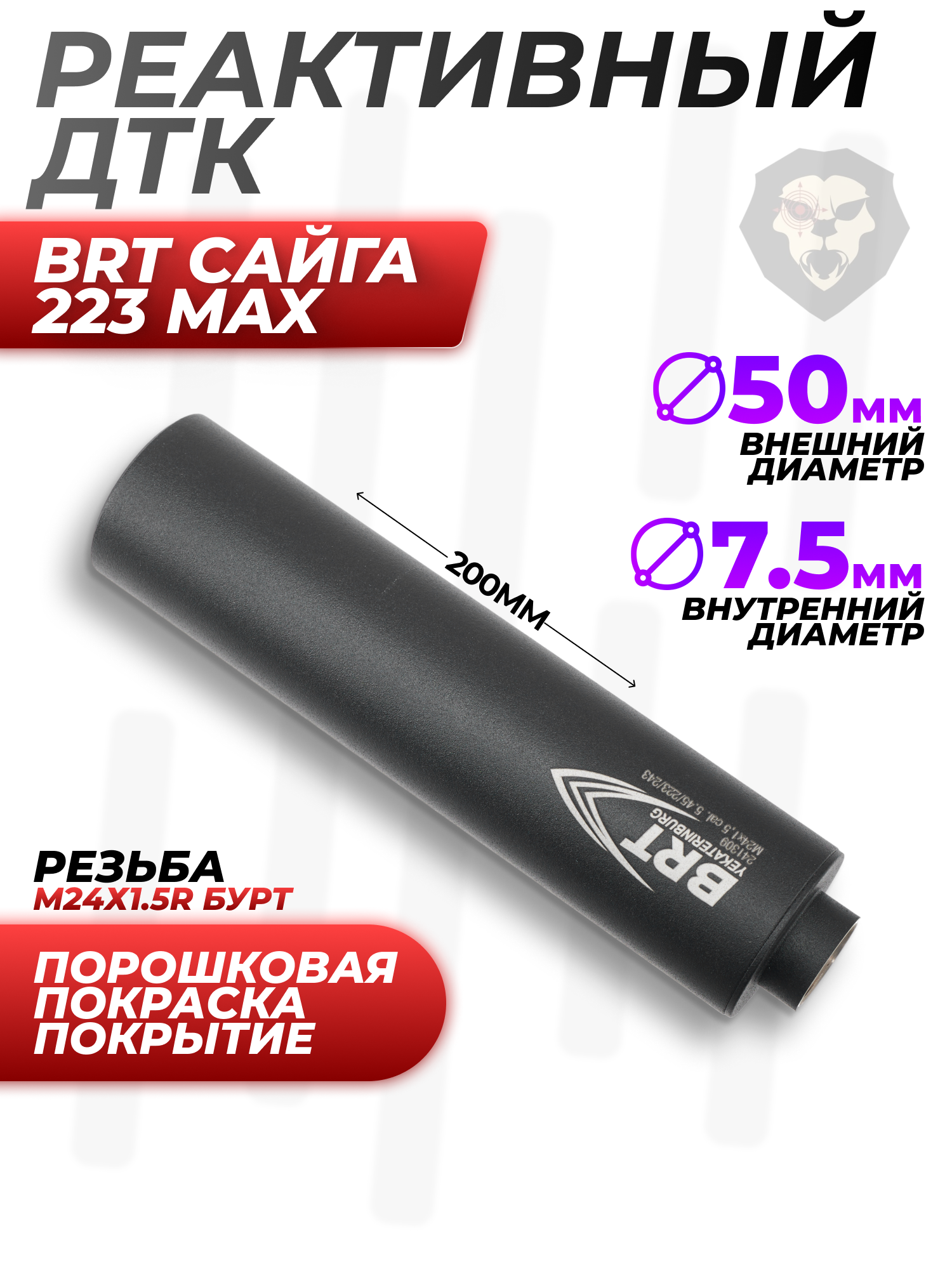 Информация о товаре "Реактивный ДТК BRT для Сайга 223 MAX (дульный тормоз, 5.56х45 мм, .223 Rem)" носит ознакомительный характер, и не является публичной офертой, определяемой положениями Статьи 437 Гражданского кодекса Российской Федерации, характеристики, внешний вид, цвет и комплектация могут быть изменены производителем без уведомления.
