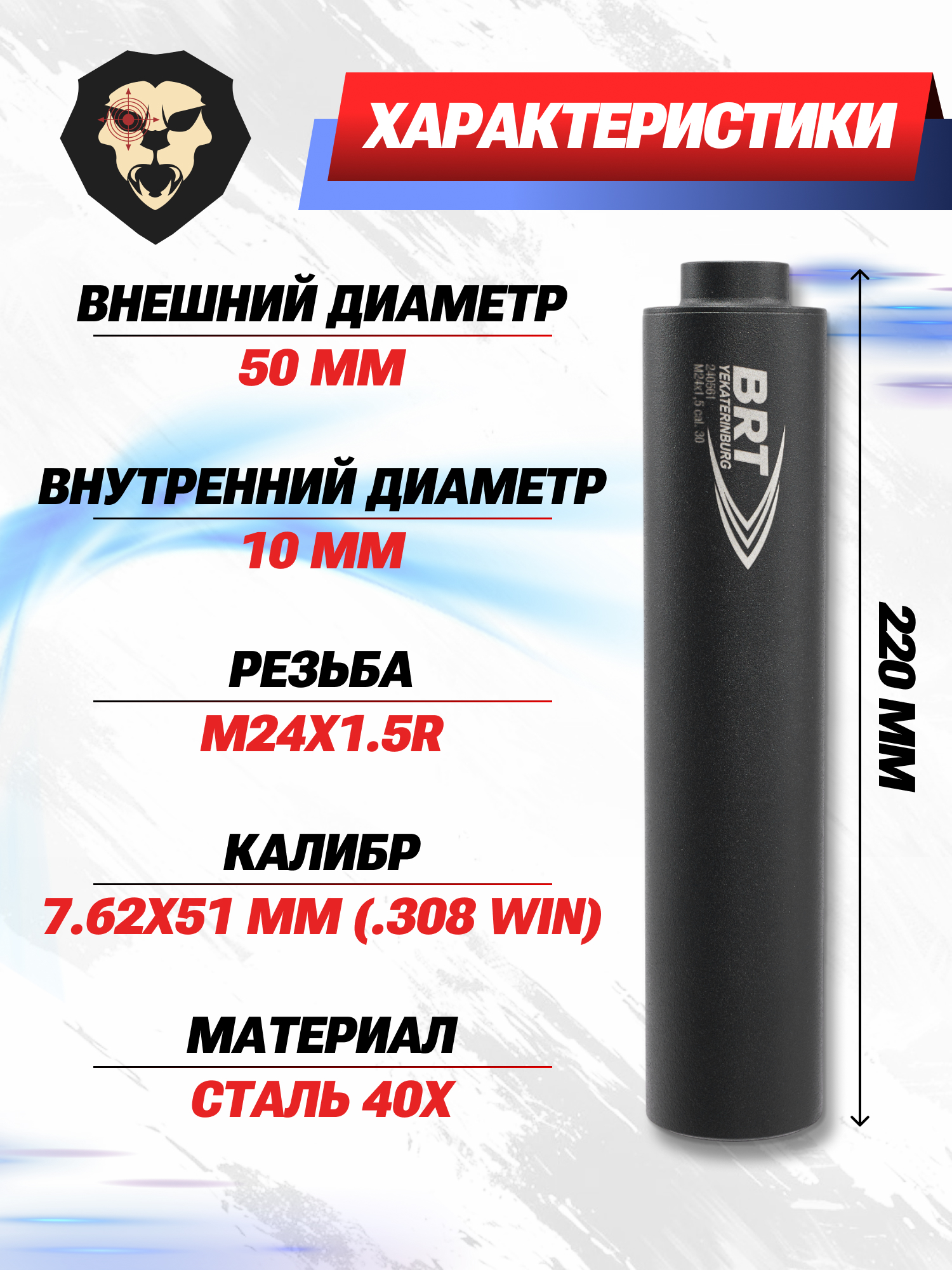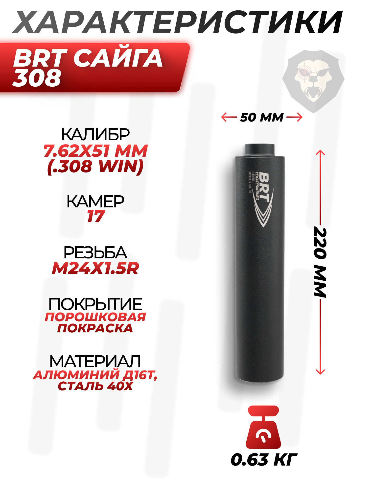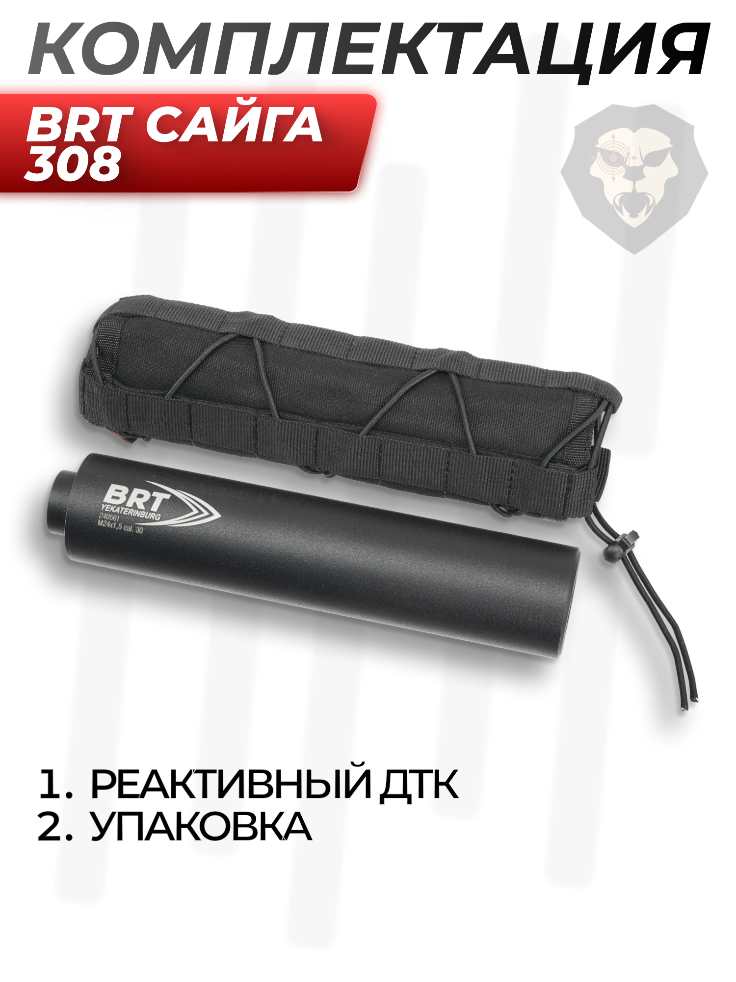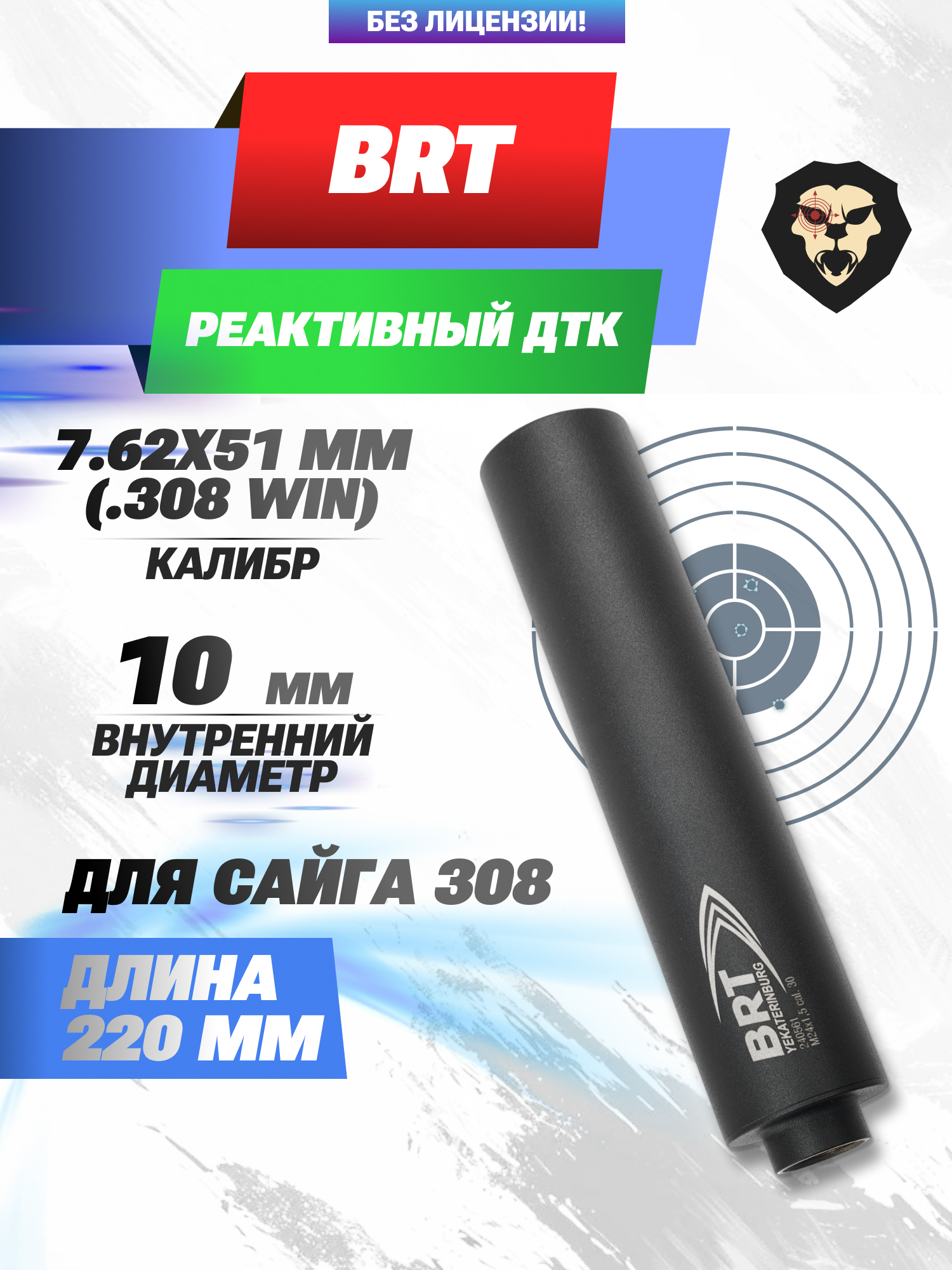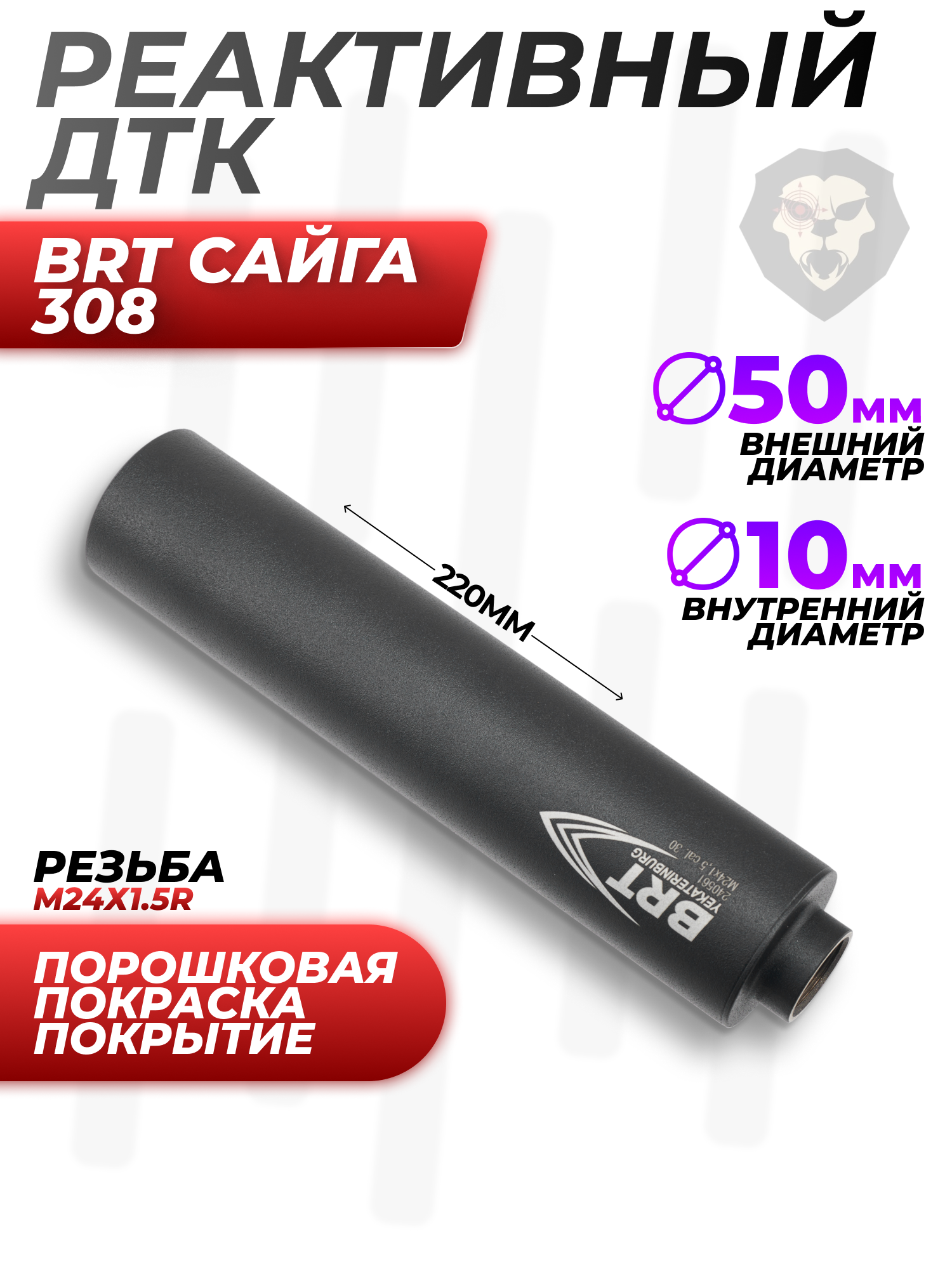 Представленный ДТК BRT содержит резьбу M24х1.5R, посредством которой устройство накручивается на дульный срез гражданских спортивных и охотничьих карабинов «Сайга» под патрон калибра .308 Win. Увеличенное до 10 мм пулепроходное отверстие снижает давление внутри распределяющих камер, а также уменьшает нагрев поверхности корпуса. При интенсивной стрельбе изготовитель рекомендует дополнительно использовать термостойкие чехлы.