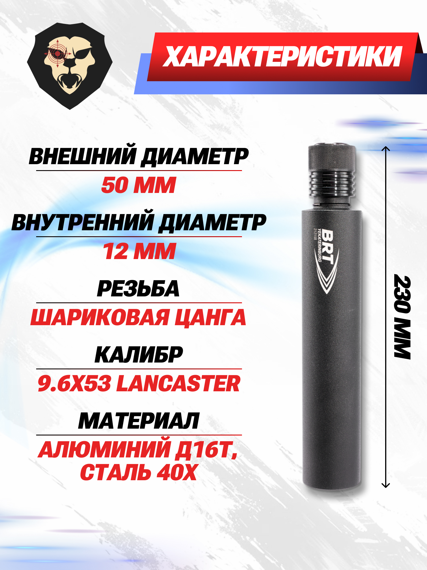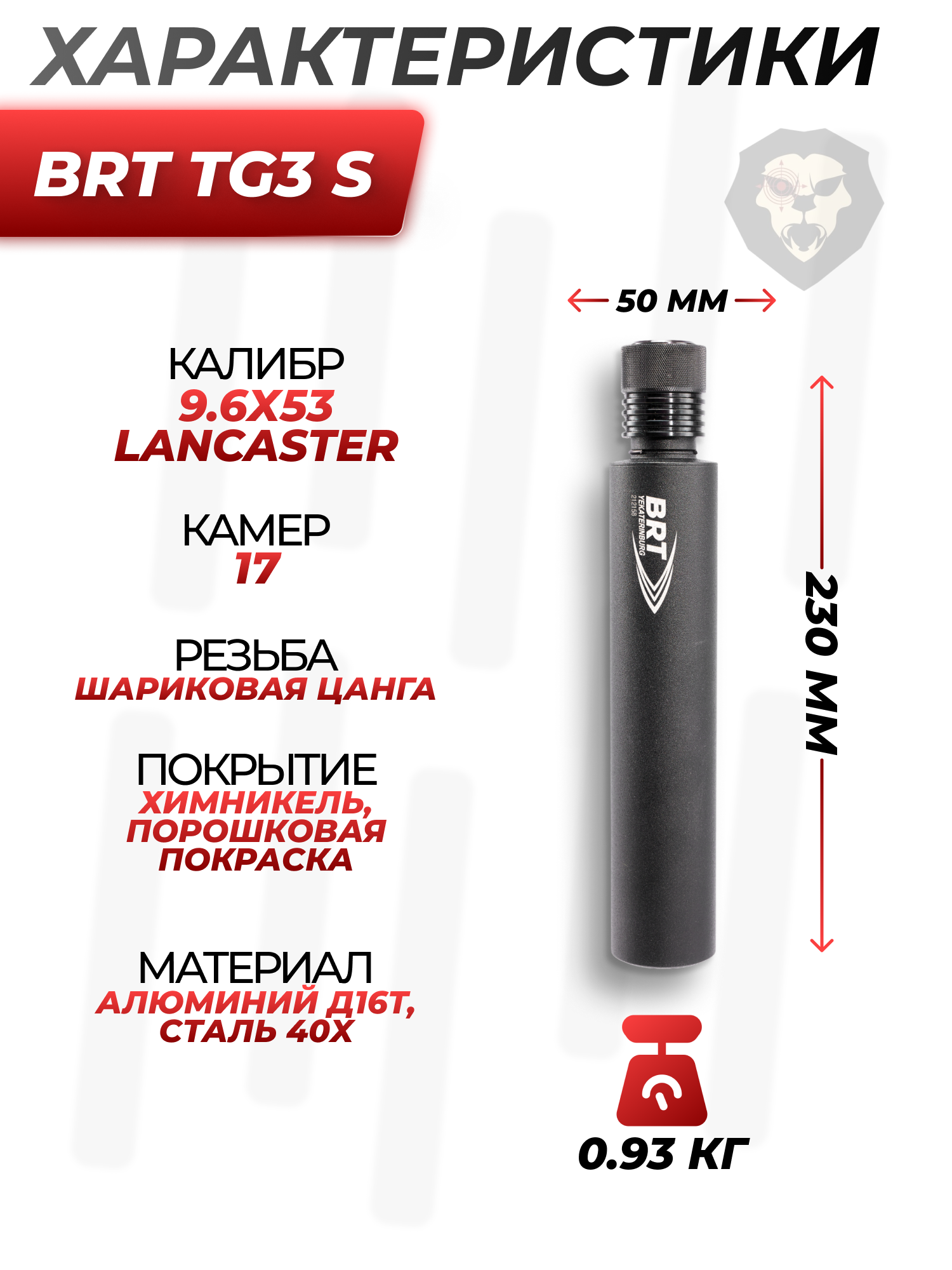 Рассматриваемый ДТК Ланкастер 9.6х53 BRT для TG3 оснащается семнадцатью распределяющими конусовидными камерами, которые изготавливаются из хромированной стали, что формирует повышенную устойчивость прибора к нагрузкам и обеспечивает рабочий ресурс до 10000 выстрелов. Чтобы при этом сохранить комфортную для стрелка массу изделия в 496 граммов производитель применил облегченный авиационный алюминий для создания корпуса устройства длиной 230 миллиметров.