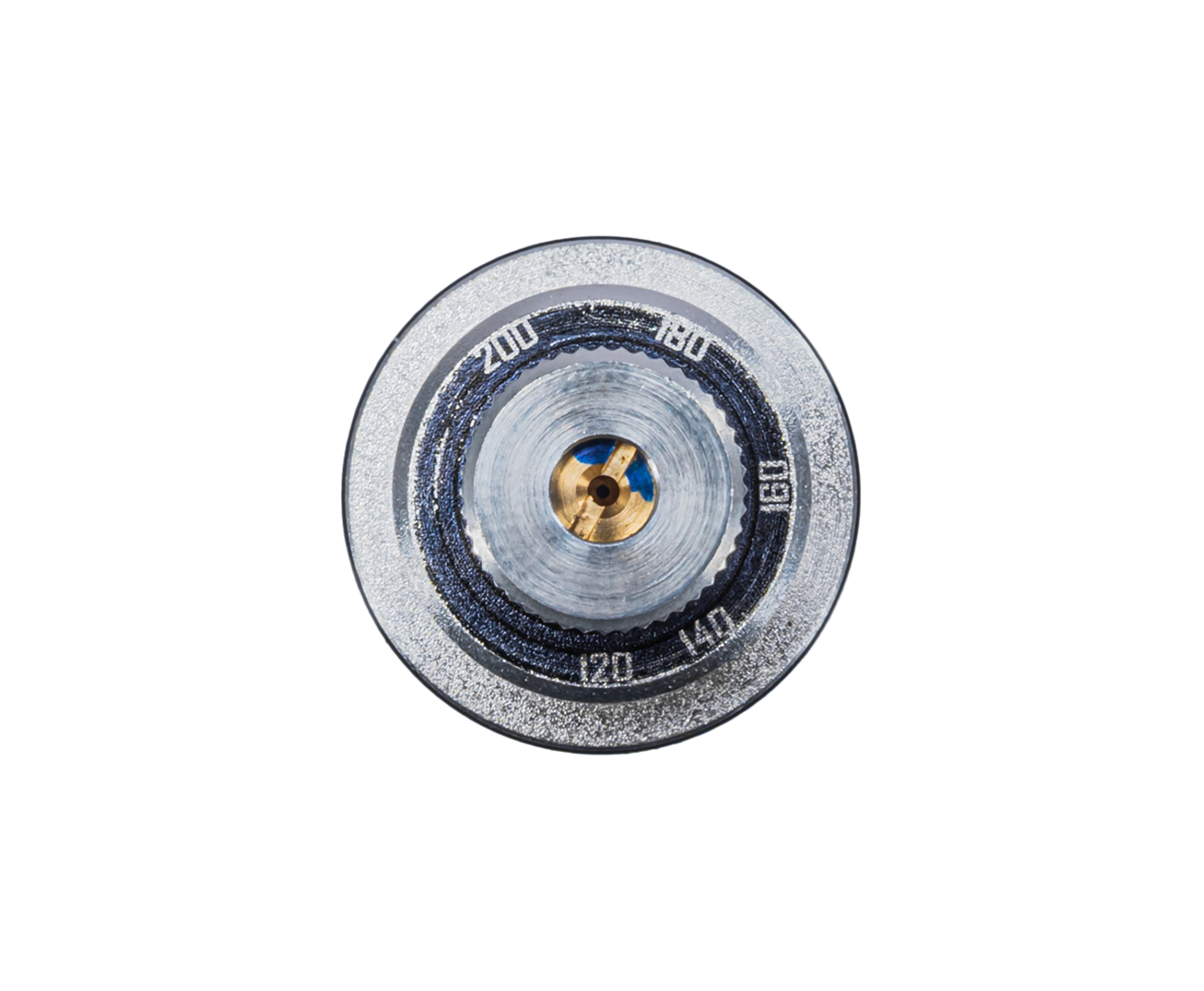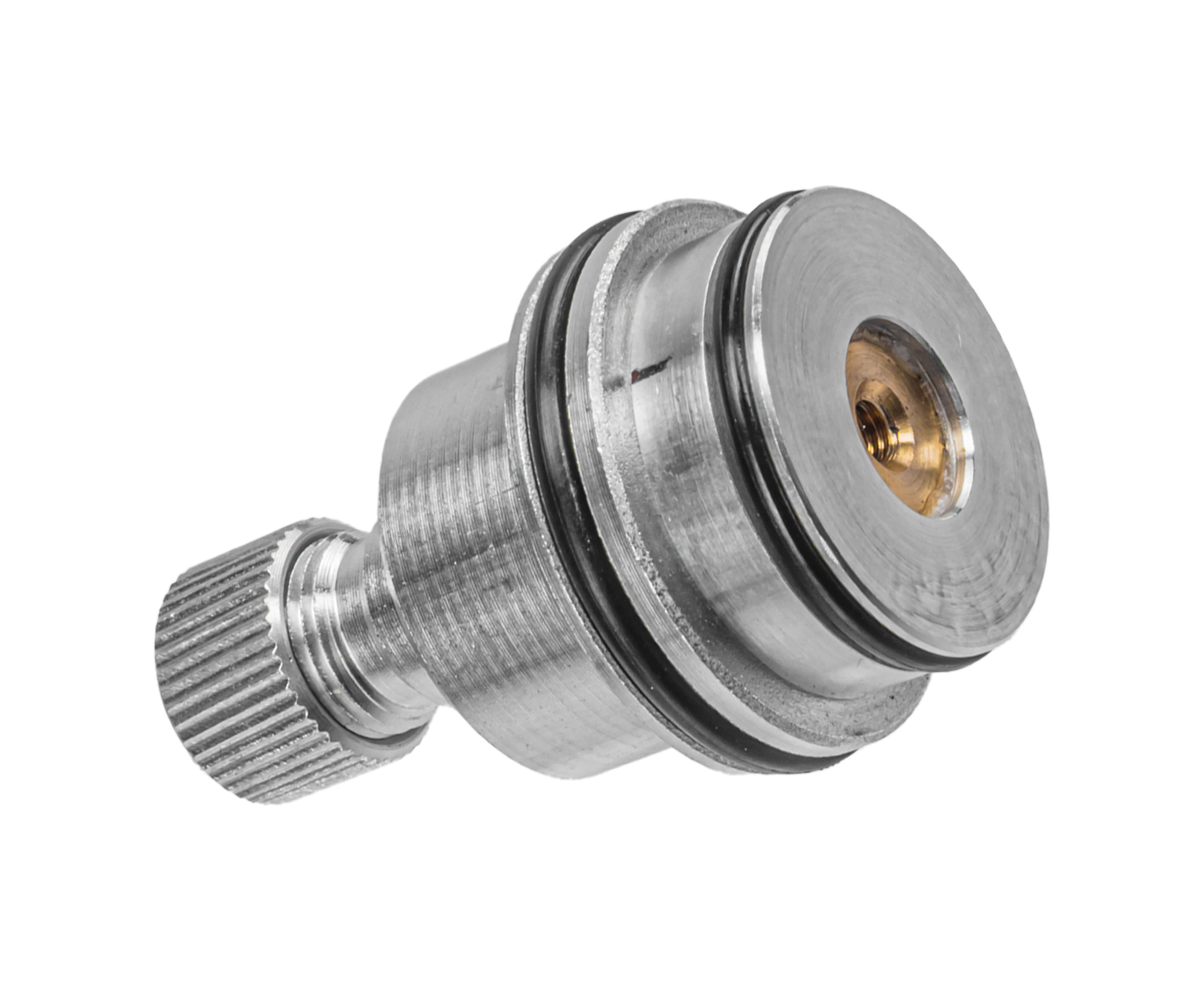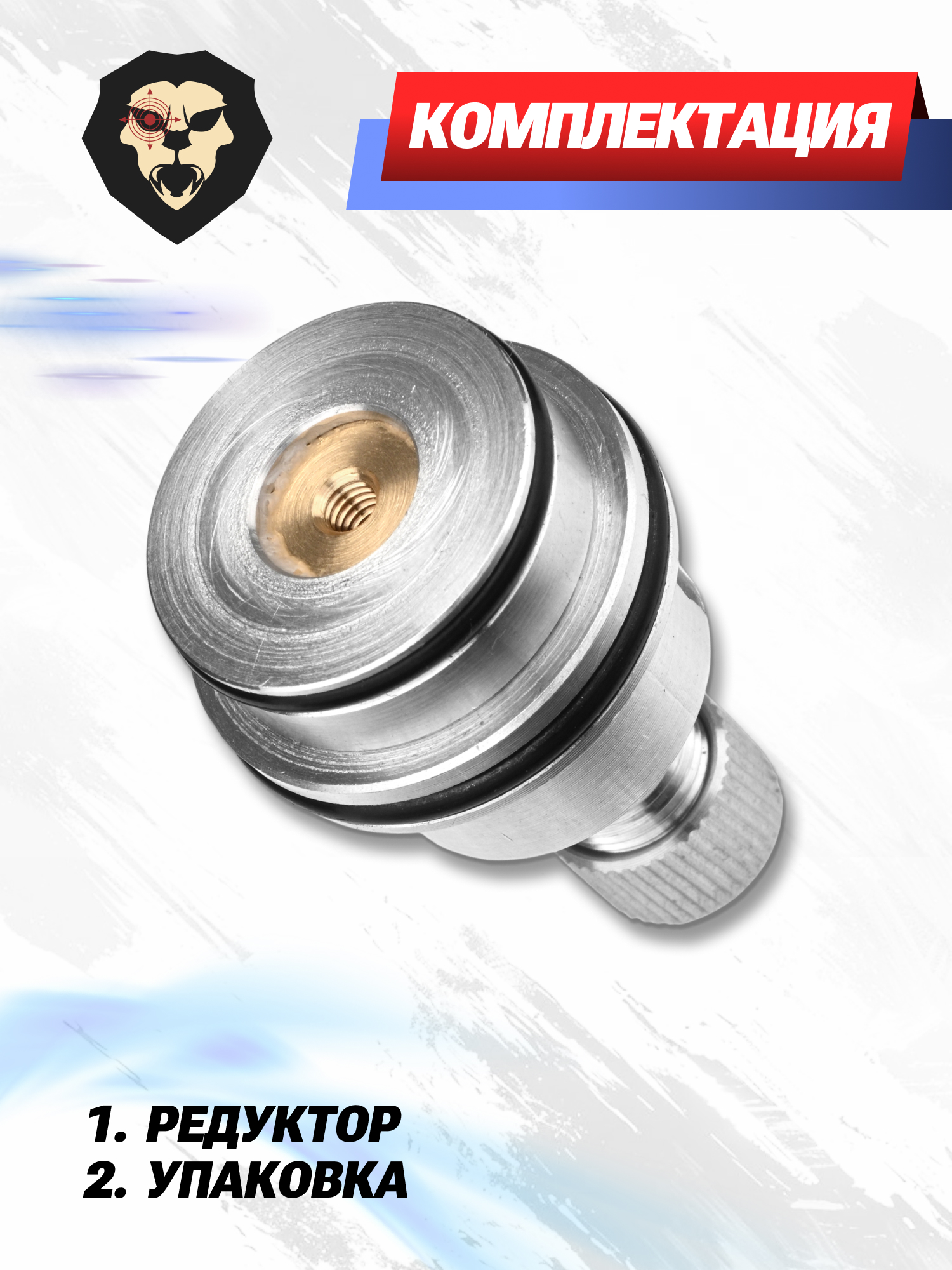 Корпус вкладного редуктора выполнен из прочного металла, а настройка выполняется вращением винта - для удобства по периметру нанесены цифровые обозначения. Монтаж в ресивер предполагается при помощи специальных стаканов объемом 30, 45 и 62 куб. см, докупаемых отдельно. Для герметизации соединения узел поставляется с двумя резиновыми уплотнительными кольцами.