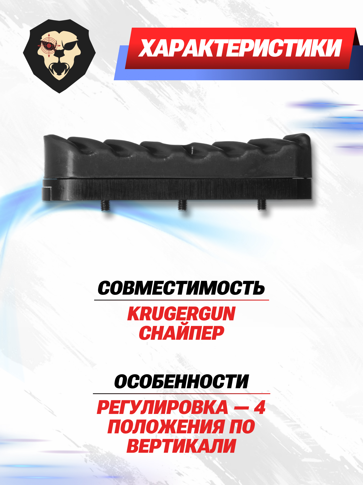 Деталь для Крюгерган Снайпер состоит из дюралевой основы и крепящегося к ней резинового элемента. Внешняя часть подвижна, что допускает перемещение эластичной основы на 4 положения вниз.