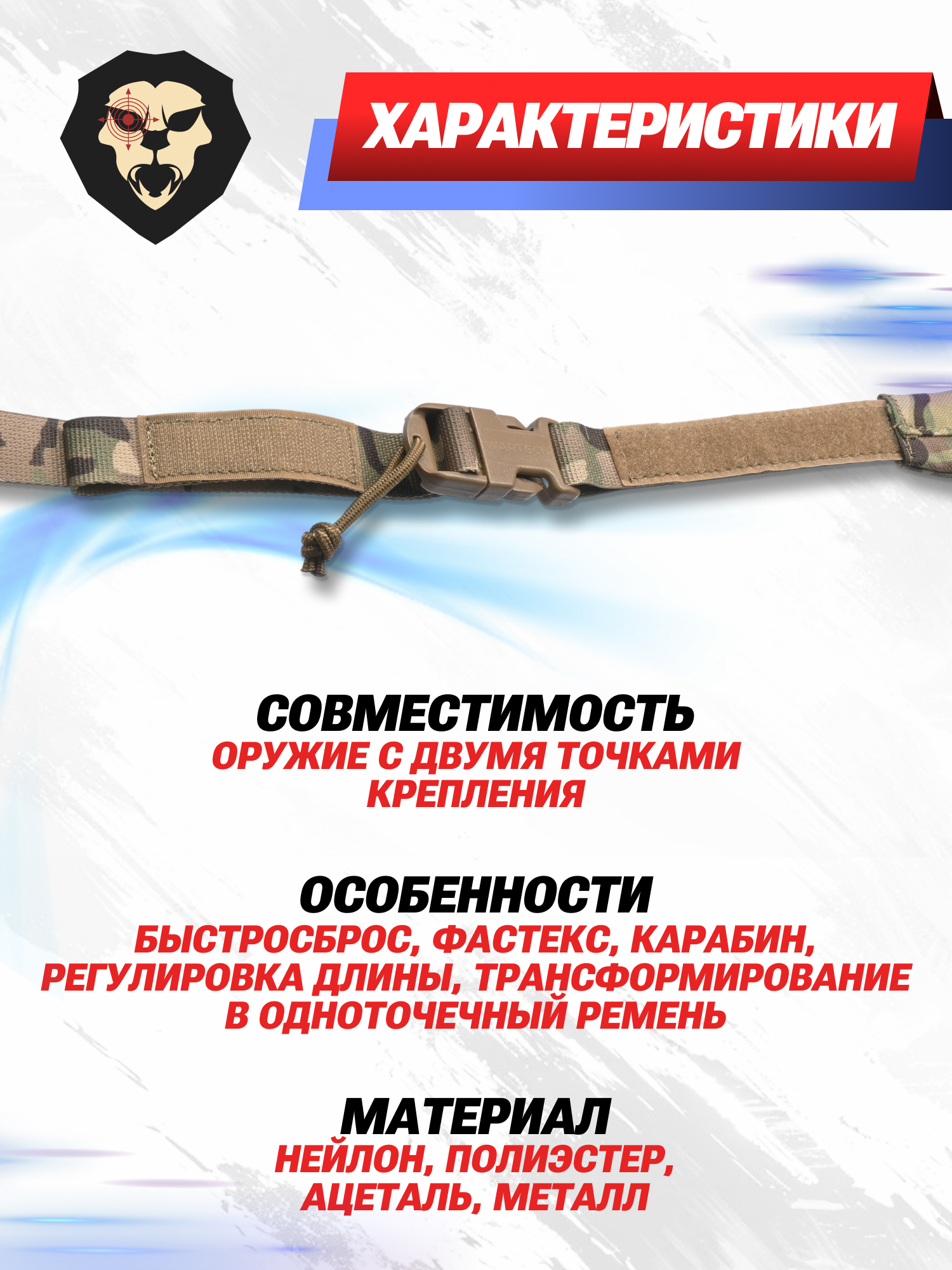 | Особенности | Быстросброс, фастекс, карабин, регулировка длины, трансформирование в одноточечный ремень |
