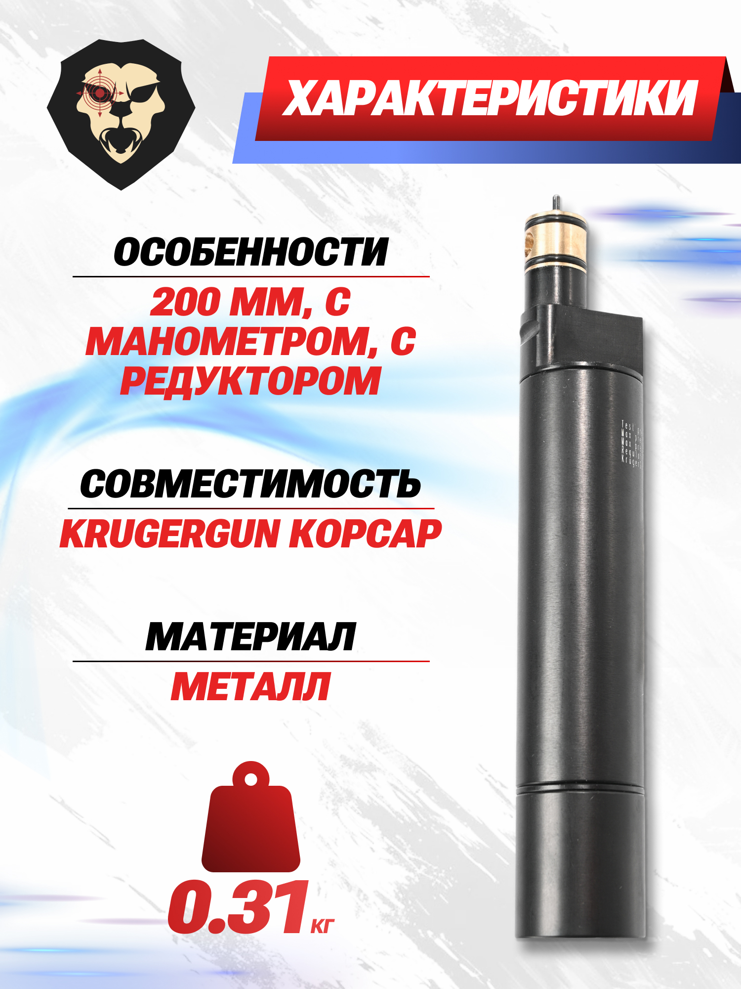 Резервуар KrugerGun Корсар D32 (с редуктором, 200 мм, с манометром) купить в интернет-магазине Popadiv10.
