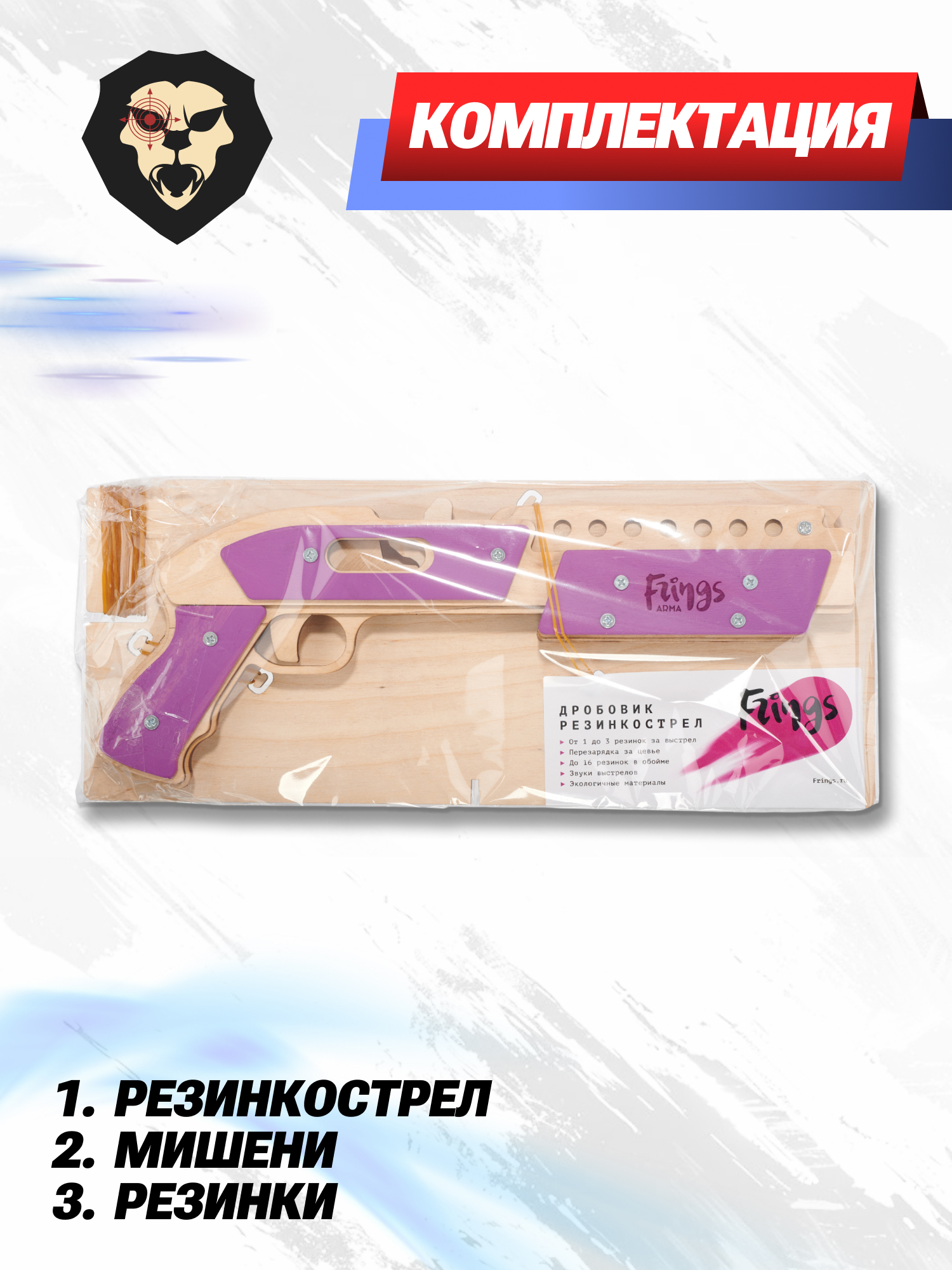 Каркас и функциональные элементы макета дробовика размером 430x150 мм изготавливаются из предварительно вырезанных деревянных панелей, скрепляемых металлическими штифтами. Детали конструкции проходят тщательную процедуру шлифовки, чтобы исключить возможность получения заноз во время игры. Совместно с резинкострелом поставляется комплект снарядов, а также деревянная коллекционная мишень, способная выдержать многократные попадания.