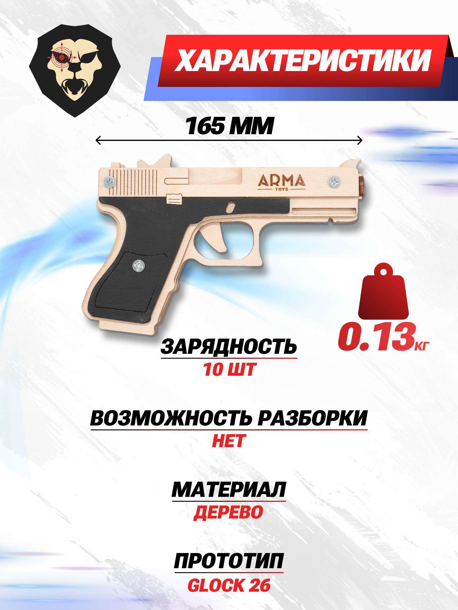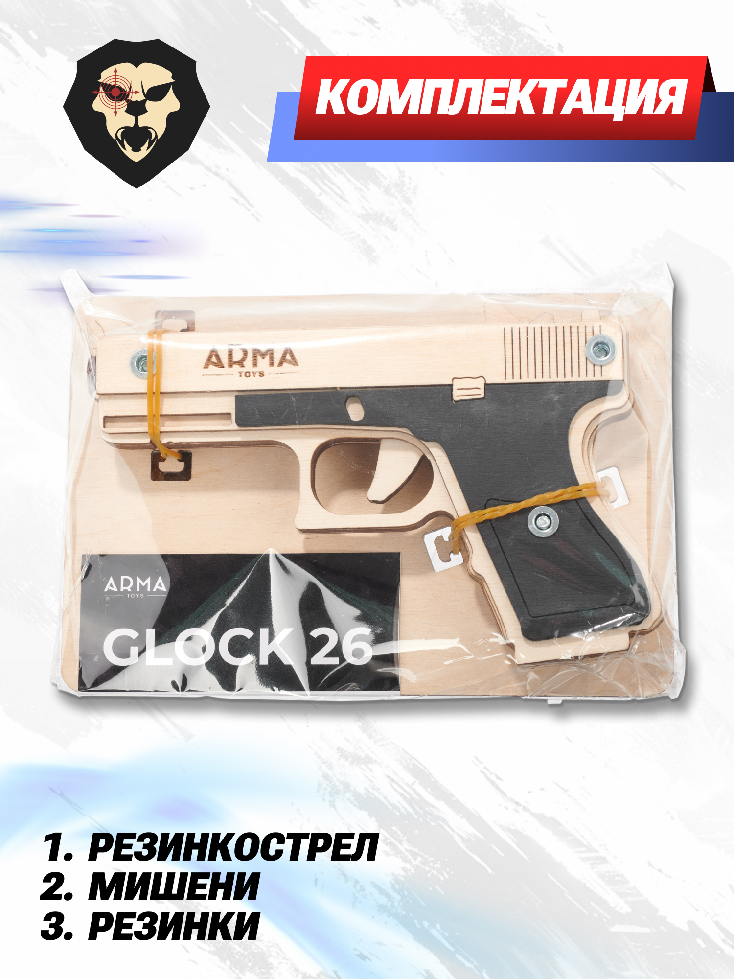 Рассматриваемая реплика представляет собой макет субкомпактной версии Glock 26, применяемой в основном гражданскими стрелками в США и других странах в роли оружия самообороны. В качестве боеприпасов деревянная модель от российской компании использует эластичные резинки, которые являются безопасными для окружающих, что дает использовать Глок резинкострел в качестве игрушки для детей.