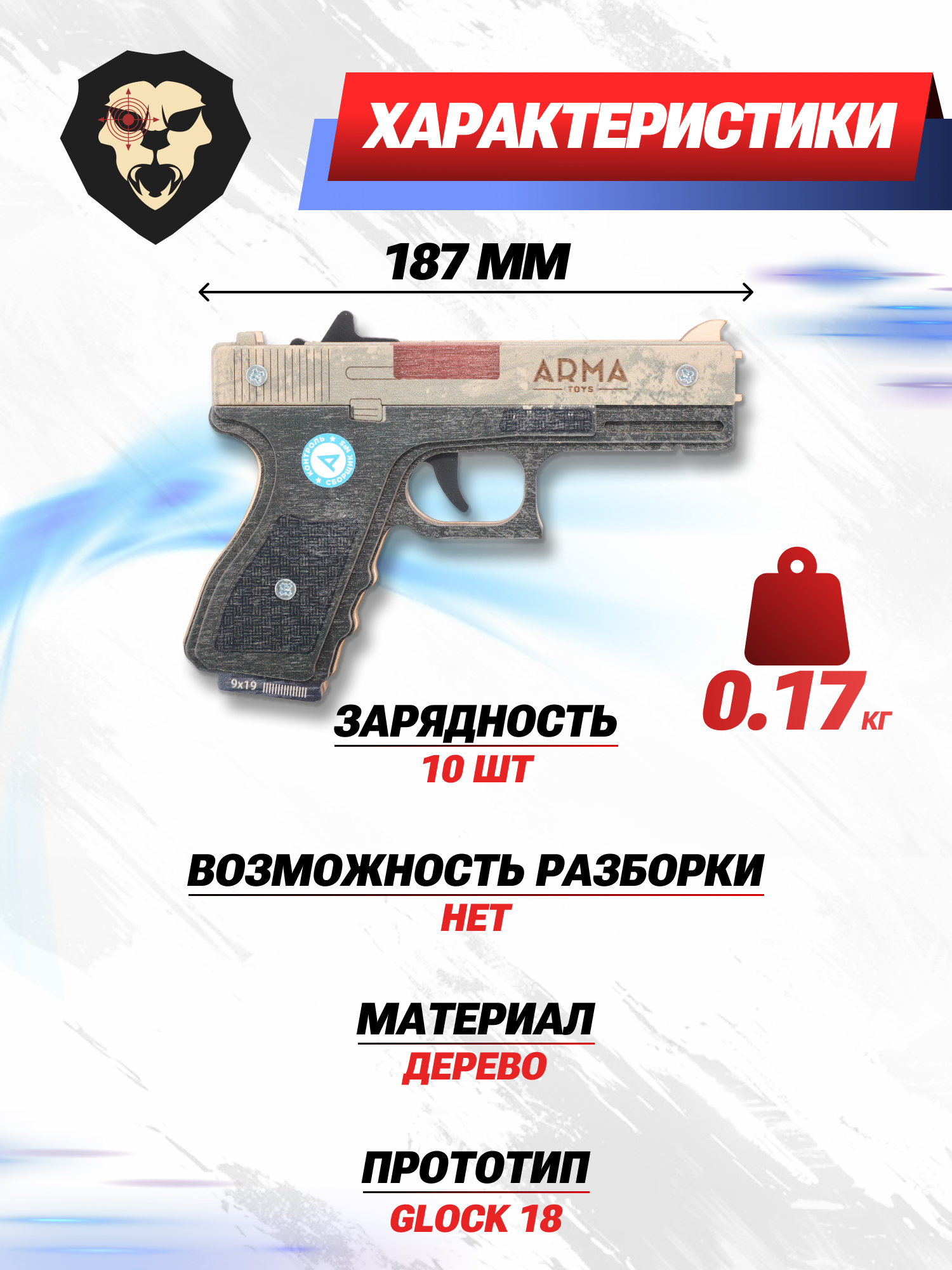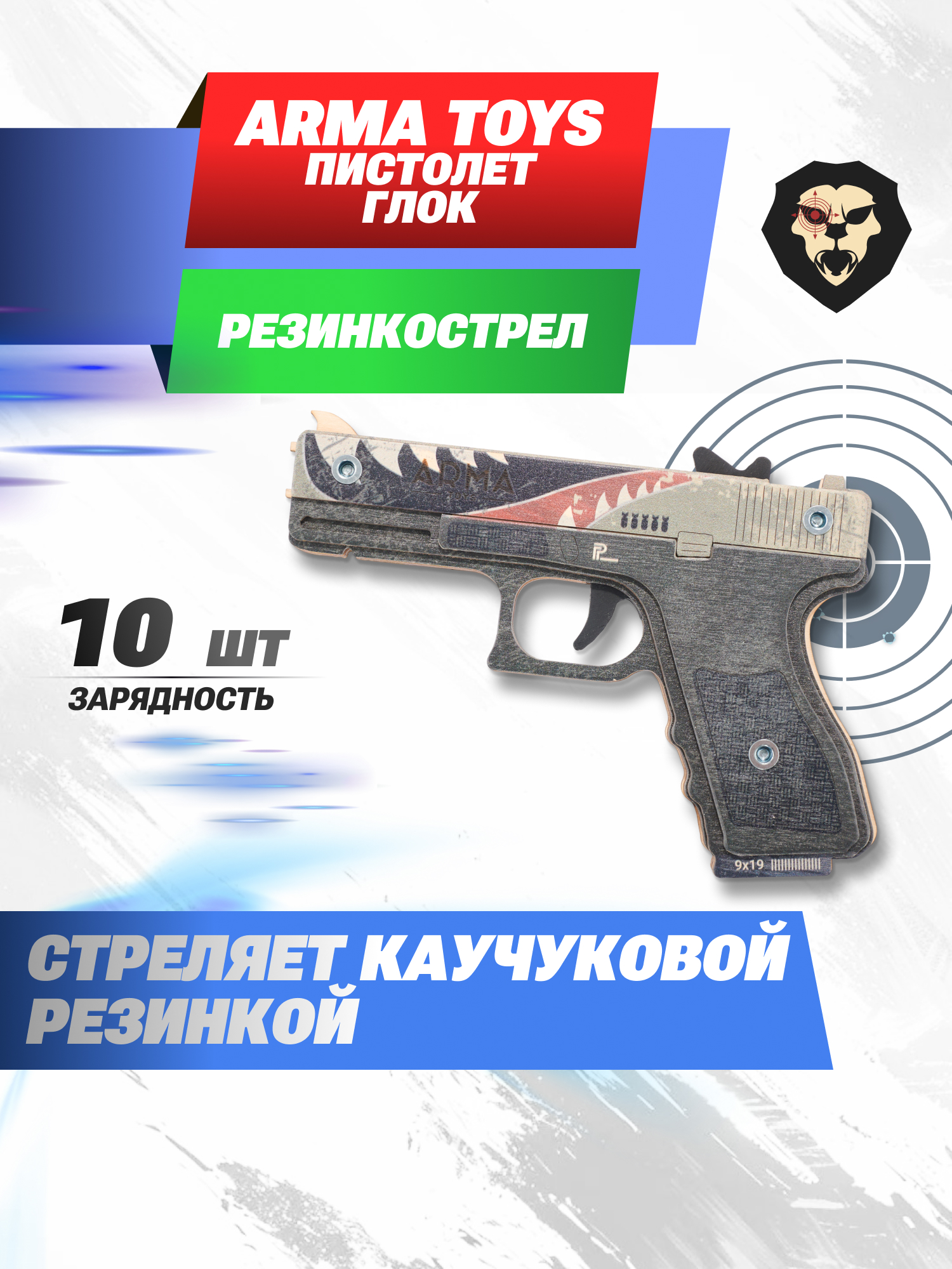 Отличительная черта всех выпускаемых изделий фирмы Arma заключается в возможности метания каучуковых эластичных жгутов. Пистолет резинкострел Глок в расцветке Ястреб снаряжается десятью зарядами путем натягивания между поворотным зубчатым диском и зацепом, играющим роль мушки. В качестве цели подойдет комплектная мишень, при этом жгуты способны вылетать на расстояние до десяти метров.