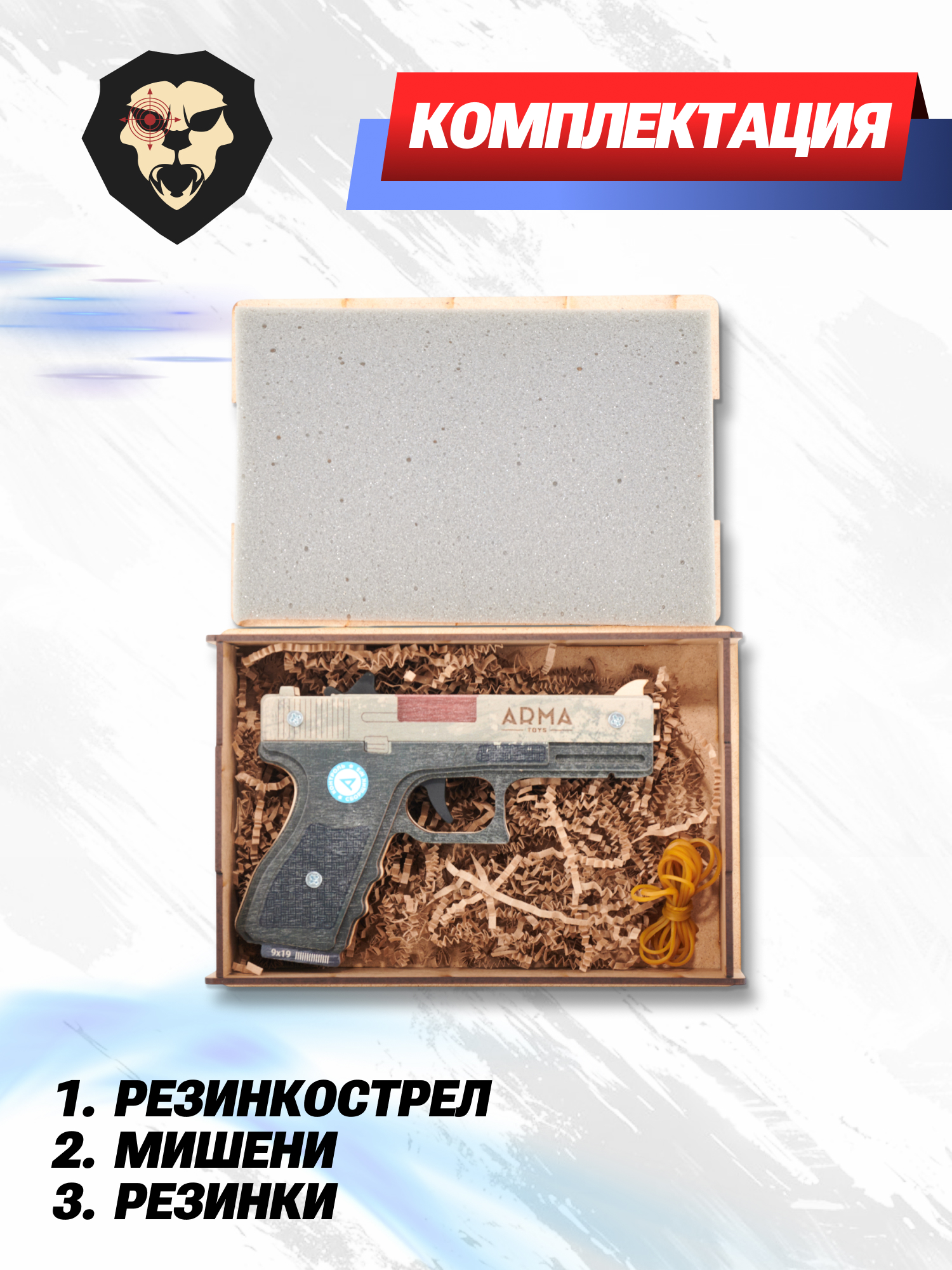 | Особенности | Скин «Ястреб» из игры CS:GO, мишень и резинки в комплекте |