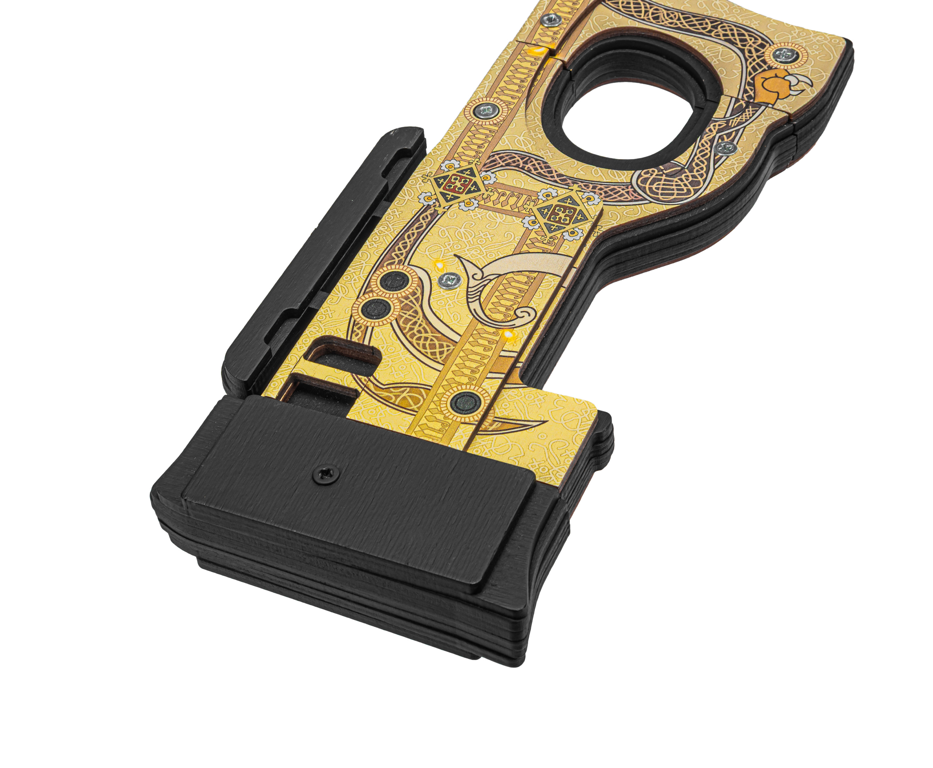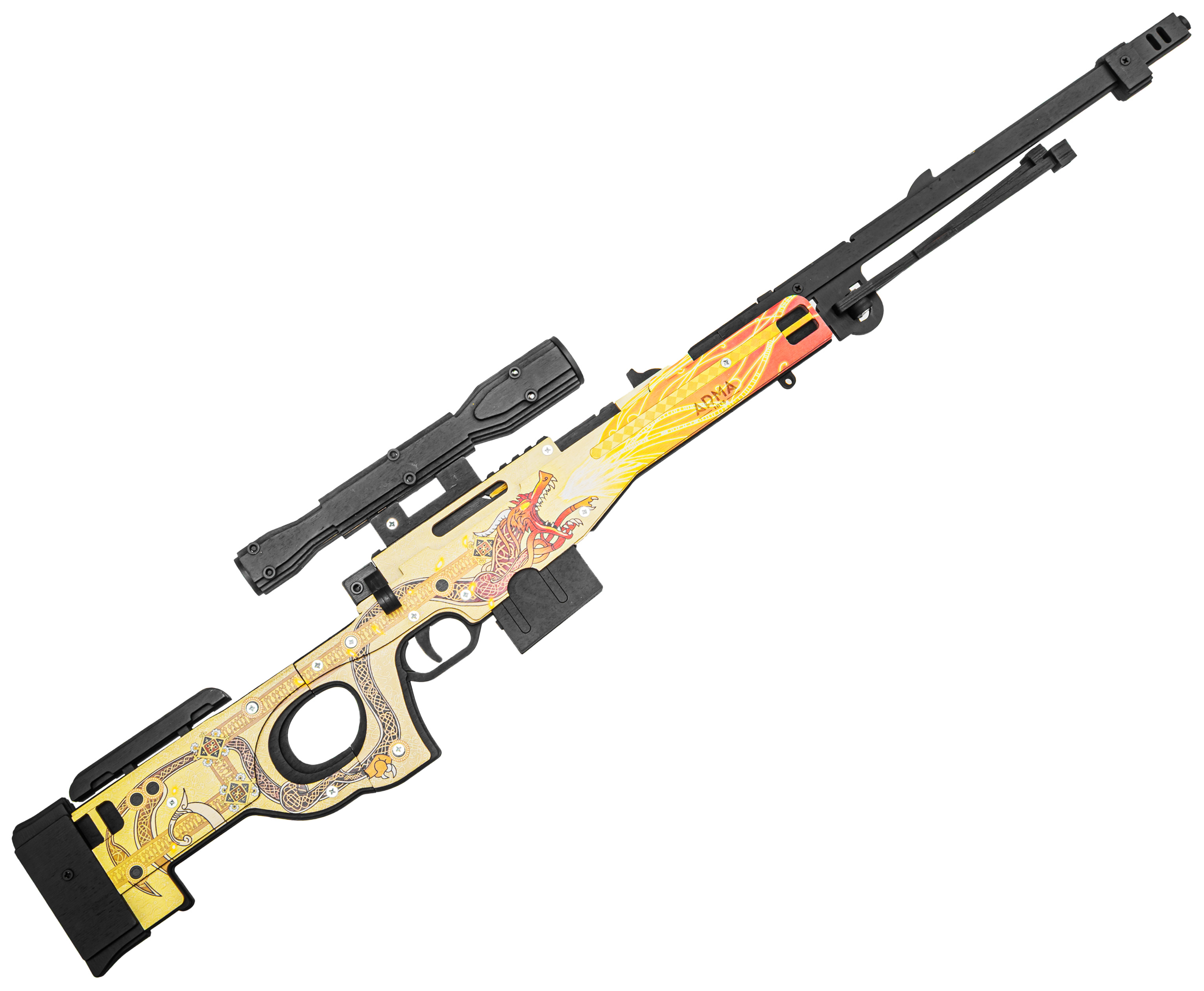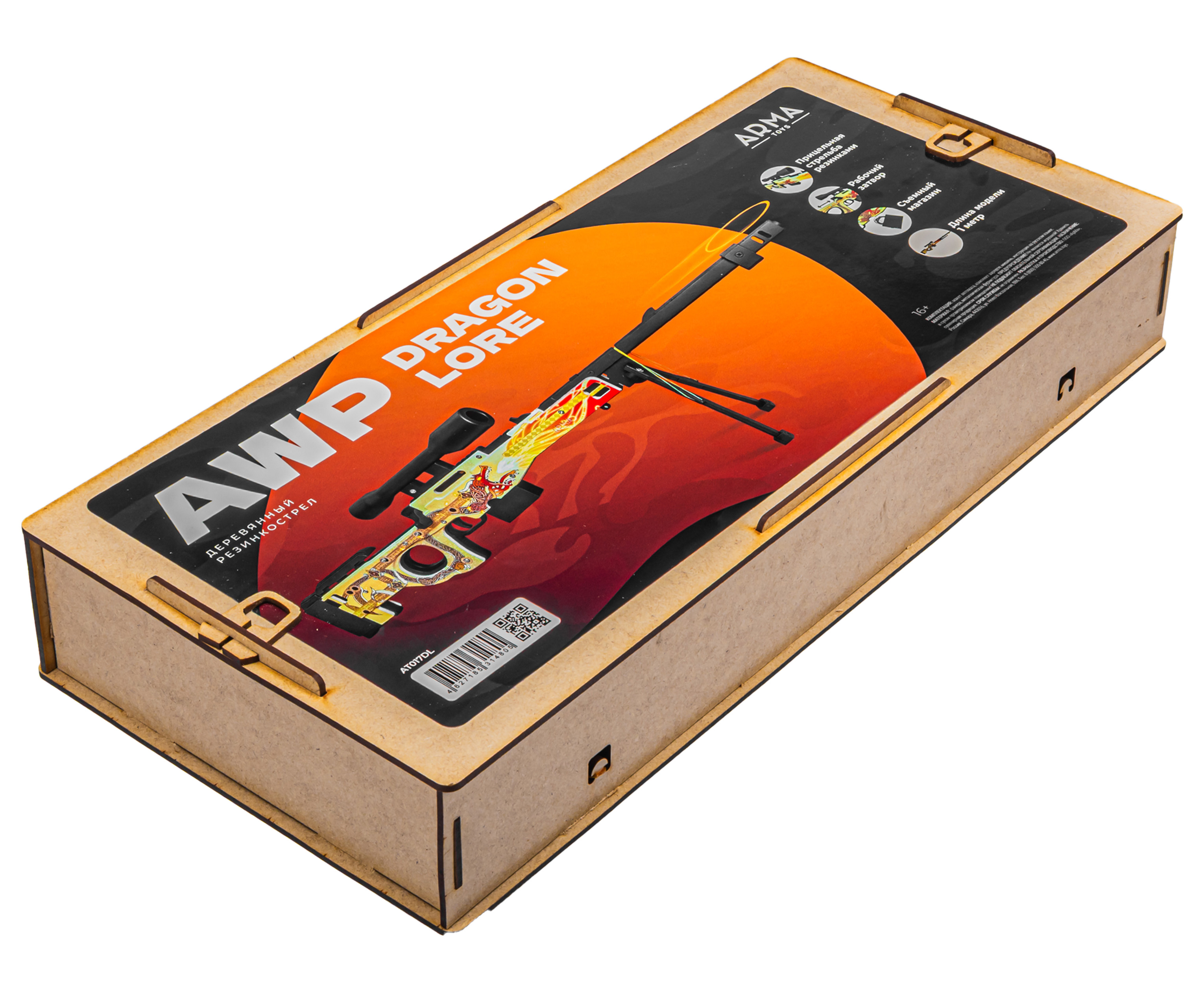 Обозреваемый макет AWP копирует строение знаменитой винтовки Accuracy International L96 британского изготовления, а также выделяется наличием невероятно редкой игровой расцветкой Dragon Lore. Изображение дракона нанесено при помощи трафарета не вызывающими аллергии акриловыми красками, стойкими к выцветанию под действием солнечных лучей. Модель выполнена в натуральную величину - 100 сантиметров, и оснащена встроенной имитацией прицела в виде полой трубки.