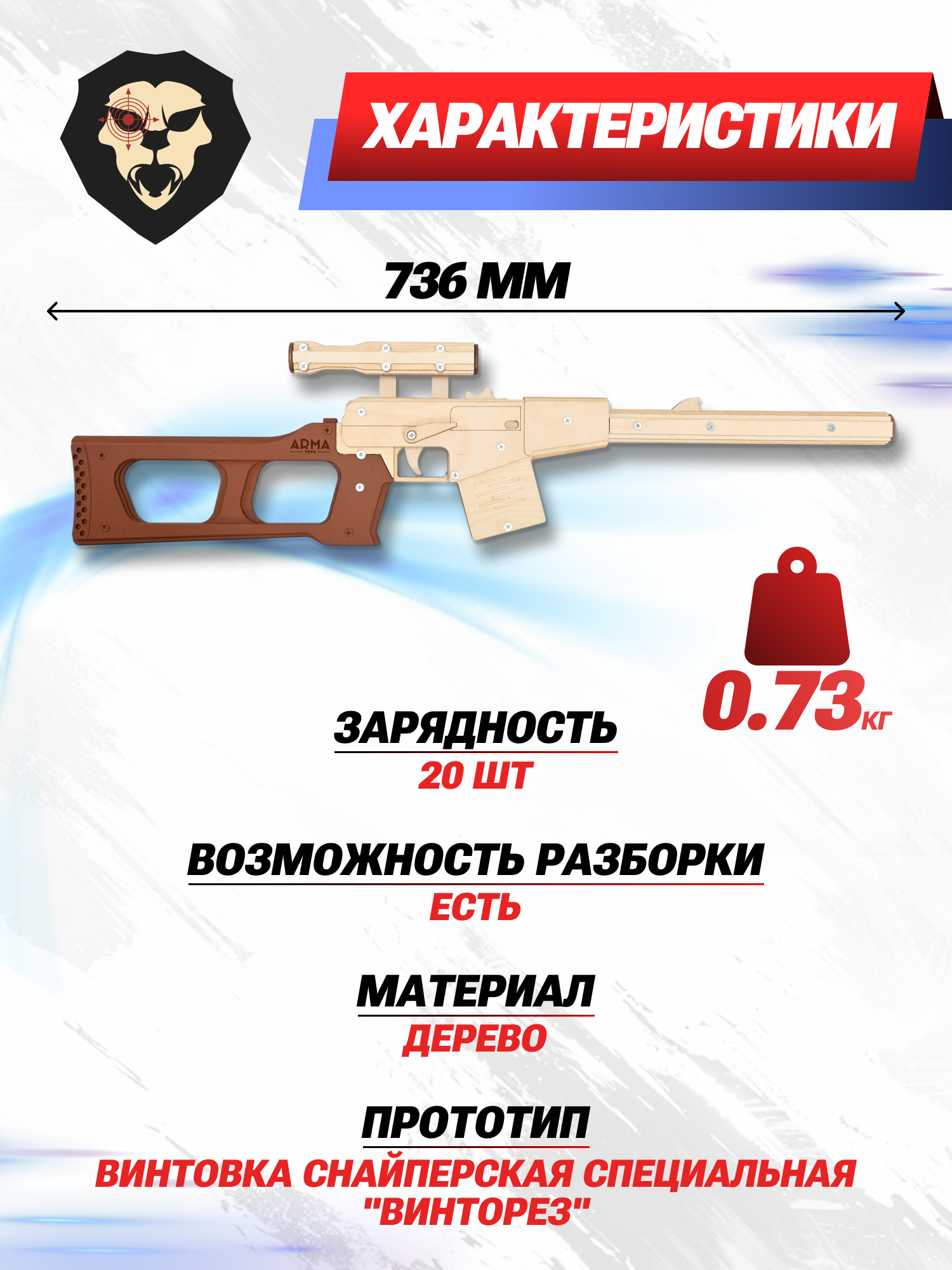 Снайперская винтовка резинкострел представленной модели детально копирует внешнее строение легендарного Винтореза и изготавливается из натуральной экологичной древесины твердых пород, не вызывающей аллергии у ребенка. Конструкция, как и боевой прототип, подразумевает разборку путем отсоединения приклада с рукояткой, а также ствола. Элементы каркаса 736 мм макета для увеличения прочностных показателей скрепляются металлическими винтами, откручивание которых выполняется комплектной крестовой отверткой.