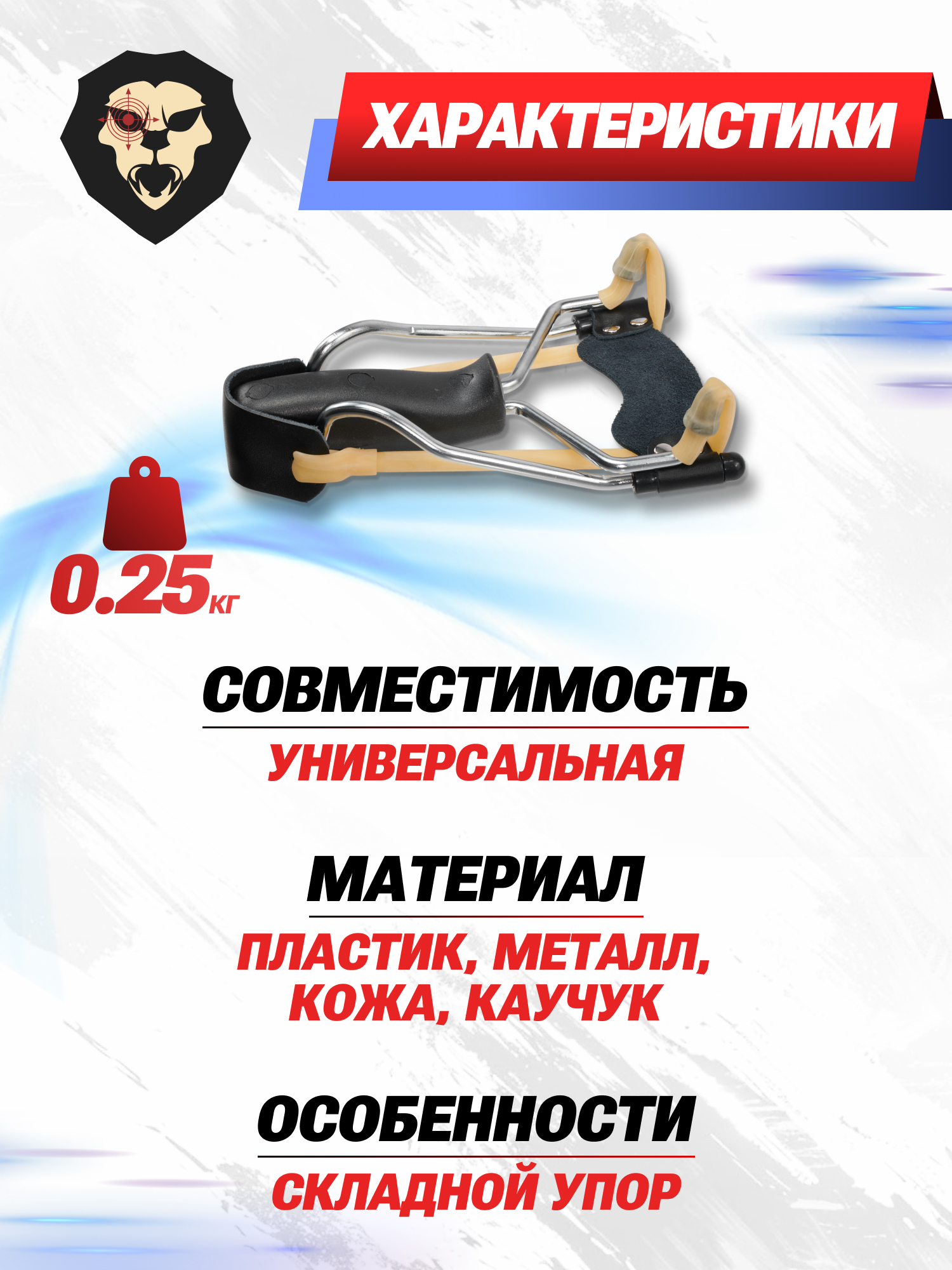 Отличительная особенность модели Мамба - это упор, который повышает стабильность прицеливания за счет переноса нагрузки на запястье. Он складной, что упрощает хранение и транспортировку изделия, сокращая его габариты. В качестве тетивы применяется эластичный резиновый жгут, насаженный на наконечники рогатины с дополнительными уплотнителями.
