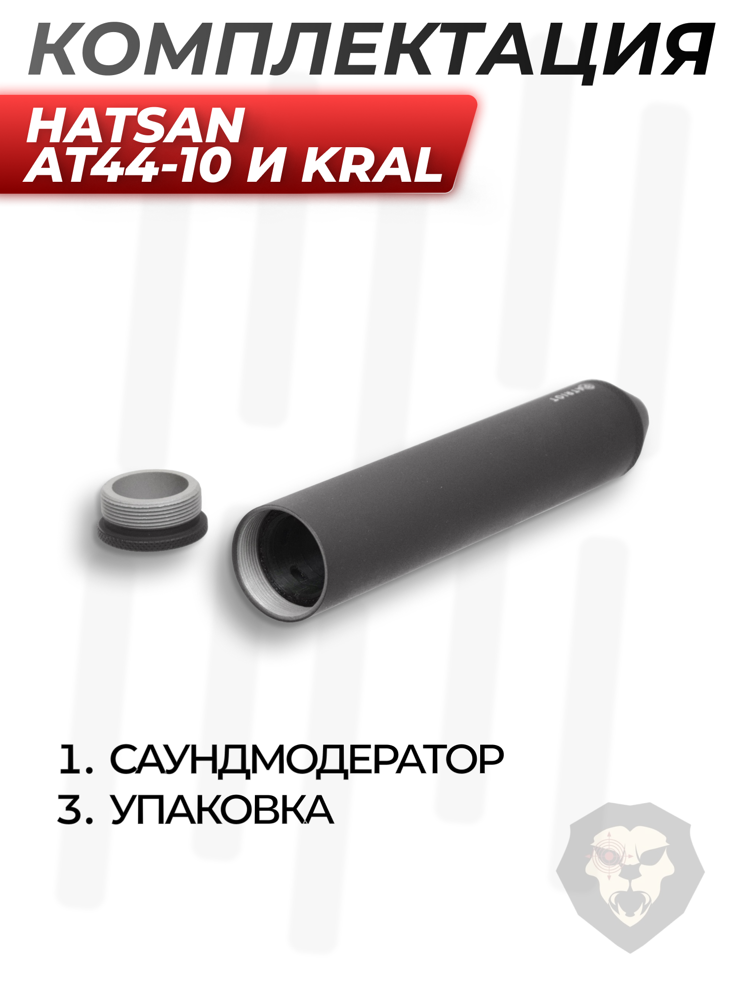Модератор Крал Панчер выполнили из металла - поверхности обработали матовой краской. Габарит насадки Патриот - 18 сантиметров.