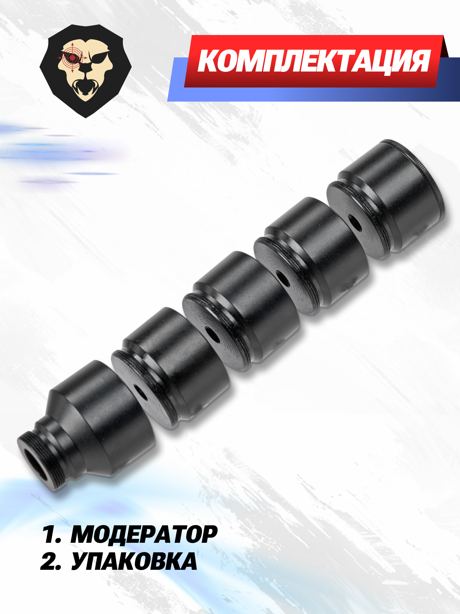 Из числа функциональных аксессуаров стоит выделить рассматриваемую ствольную насадку. Предназначается саундмодератор для пневматики Dobermann БуллПап в калибре 6.35 мм и служит для дополнительного приглушения резкости хлопка в момент совершения выстрела. Снижение громкости осуществляется за счет продуманной конструкции изделия, состоящей из пяти стаканов сепараторов.