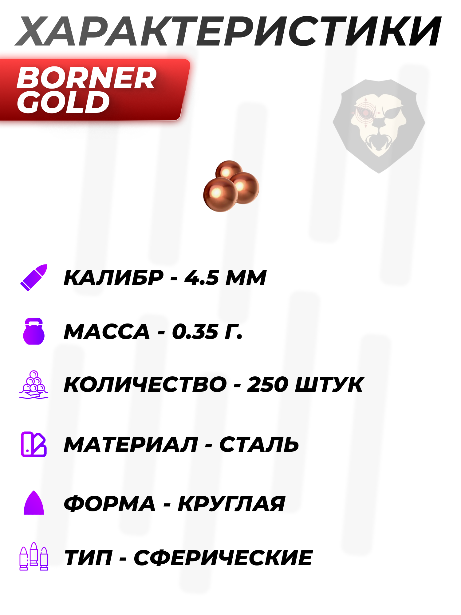 Информация о товаре "Шарики Borner Gold 4.5 мм (250 шт, омедненные)" носит ознакомительный характер, и не является публичной офертой, определяемой положениями Статьи 437 Гражданского кодекса Российской Федерации, характеристики, внешний вид, цвет и комплектация могут быть изменены производителем без уведомления.