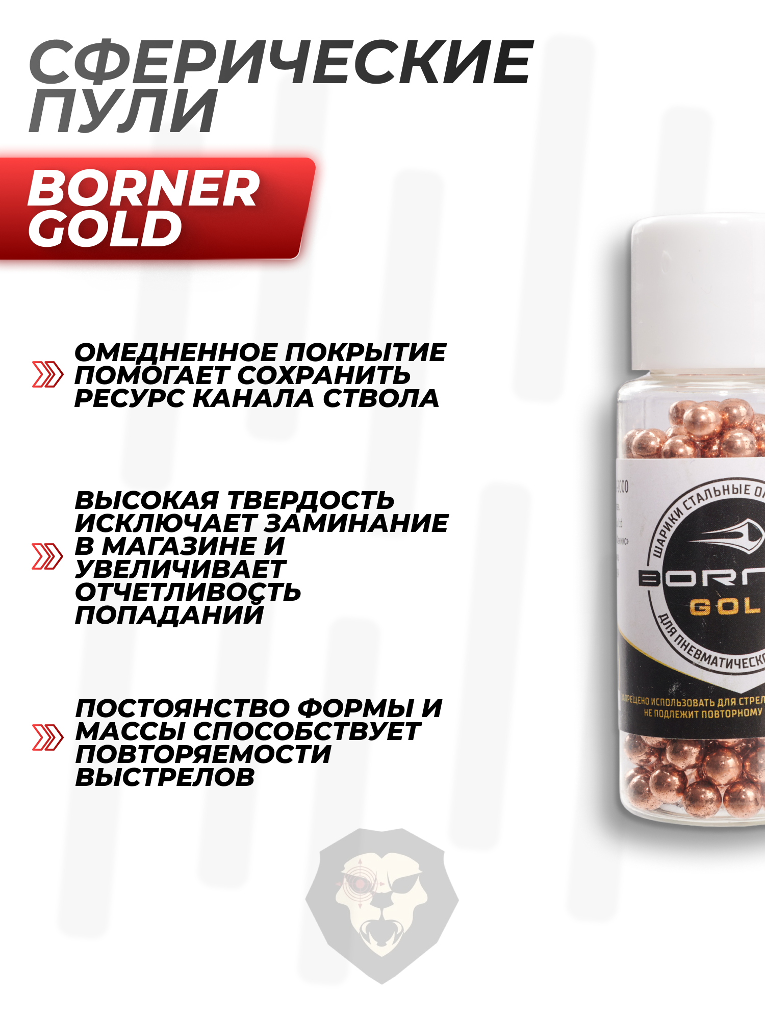 Омеднение также позволяет сократить время на техобслуживание оружия, так как в результате прохождения шариков ствол меньше загрязняется. Сферические пули Борнер Голд поставляются в пластиковой баночке, емкость которой составляет 250 зарядов. Тара дополняется удобной отвинчивающейся крышкой, защищающей снаряды от намокания в процессе транспортировки и хранения.