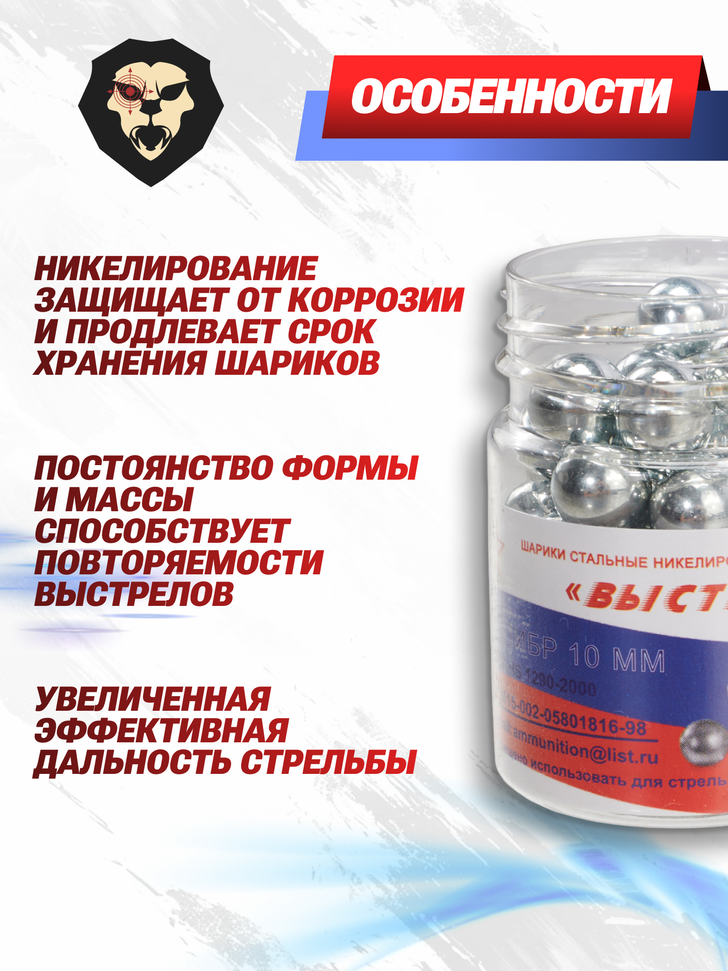 Представленные шарики Выстрел выполнены из никелированной стали и отличаются сбалансированным весом, что способствует их увеличенному расстоянию полета. Применяются эти снаряды спортсменами и любителями развлекательной стрельбы. Изготовители перед выпуском рассматриваемых боеприпасов помещают их в баночку, в которой шарики для рогатки содержатся в количестве 50 штук.