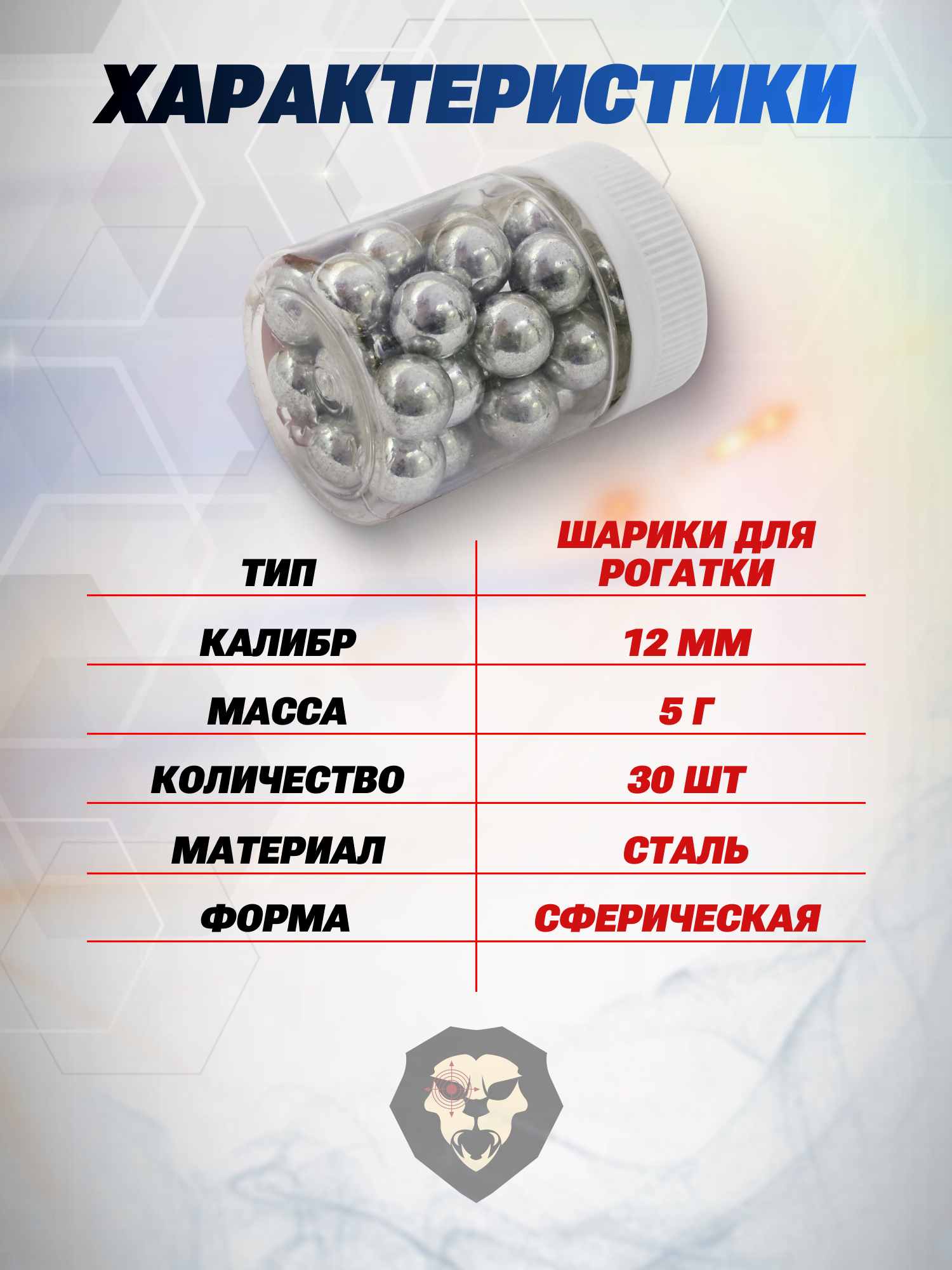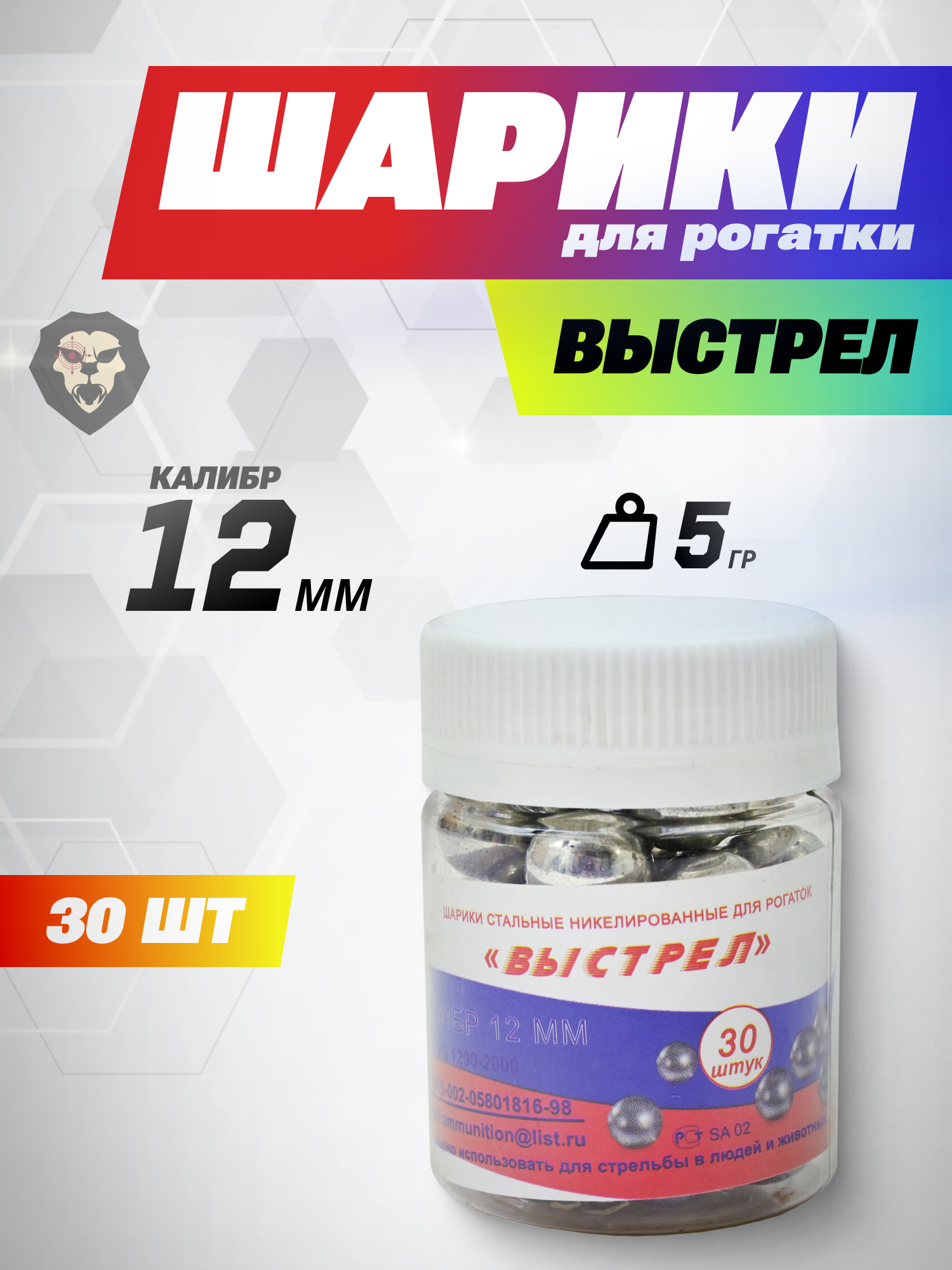 Представленные снаряды с 12-миллиметровым калибром изготавливают из стали. Эти шары для рогатки отличаются увеличенной эффективной дальностью стрельбы, обусловленной сбалансированностью веса такого боеприпаса. Рассматриваемые шарики Выстрел на рынок поступают в баночках, вмещающих каждая по 30 сферических снарядов.