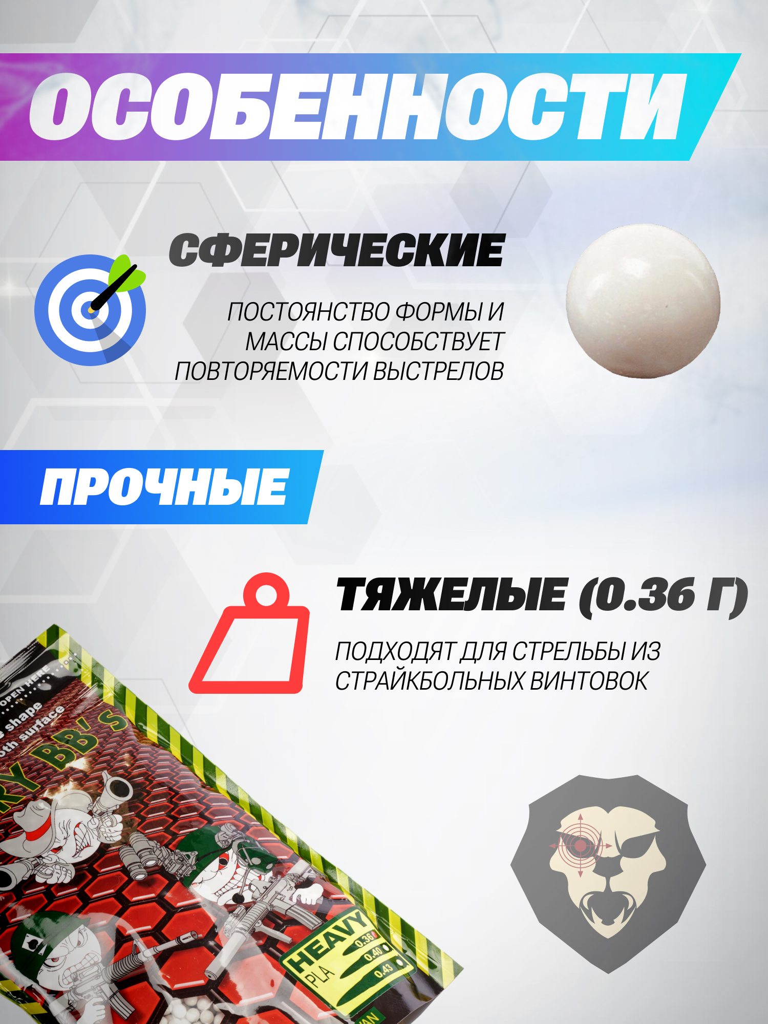 Такой расходный материал будет к месту у опытных и начинающих игроков в страйкбол. Поэтому берите эти шарики не только для себя, но и в подарок для друзей, увлекающихся этим видом спорта.