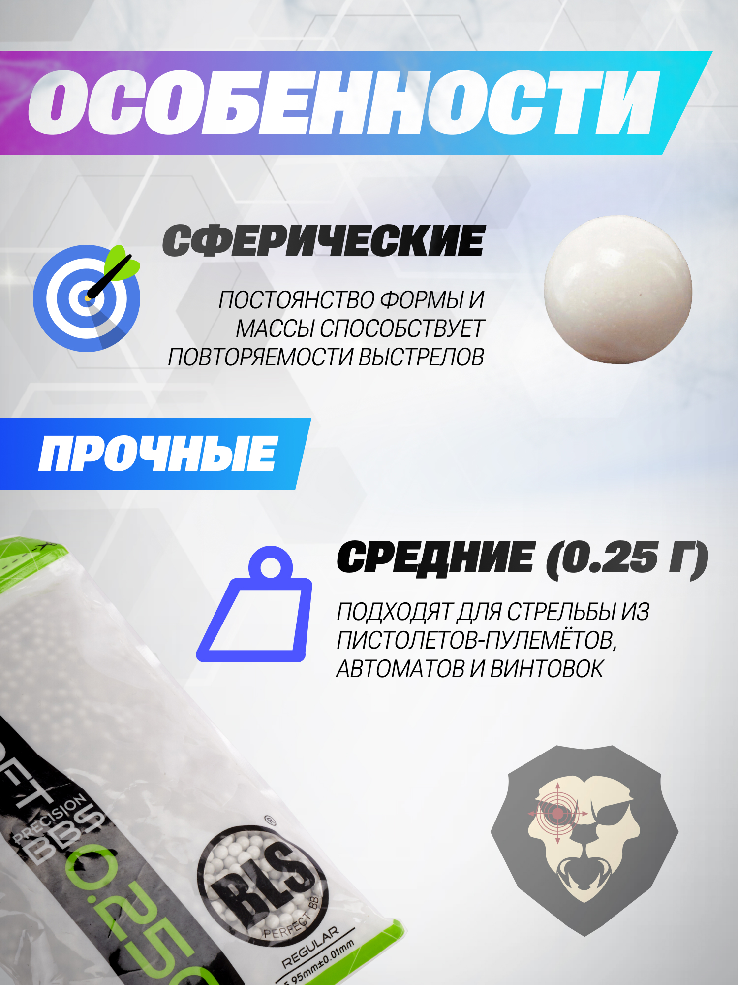 Вес боеприпаса - важнейший фактор в работе страйкбольного оружия. Правильный выбор массы сможет удовлетворить требования пользователя по точности боя, настильности и скорострельности оружия. Шары 6 мм компании BLS весом 0.25 г помогут достичь баланса между указанными характеристиками.