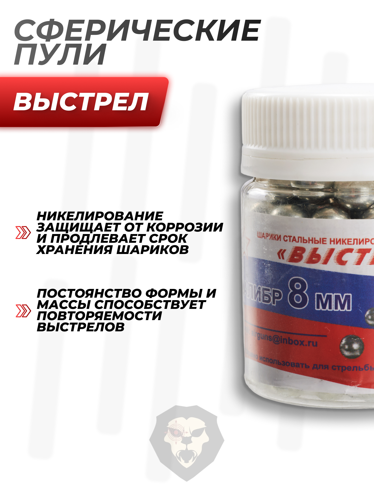 Диаметр шара составил 8 миллиметров. Такой калибр обеспечивает баланс между начальной скоростью полета пульки и передаваемой ею энергией. Также рассматриваемый заряд фирмы Выстрел комфортно удерживать в метательном жгуте перед выстрелом.