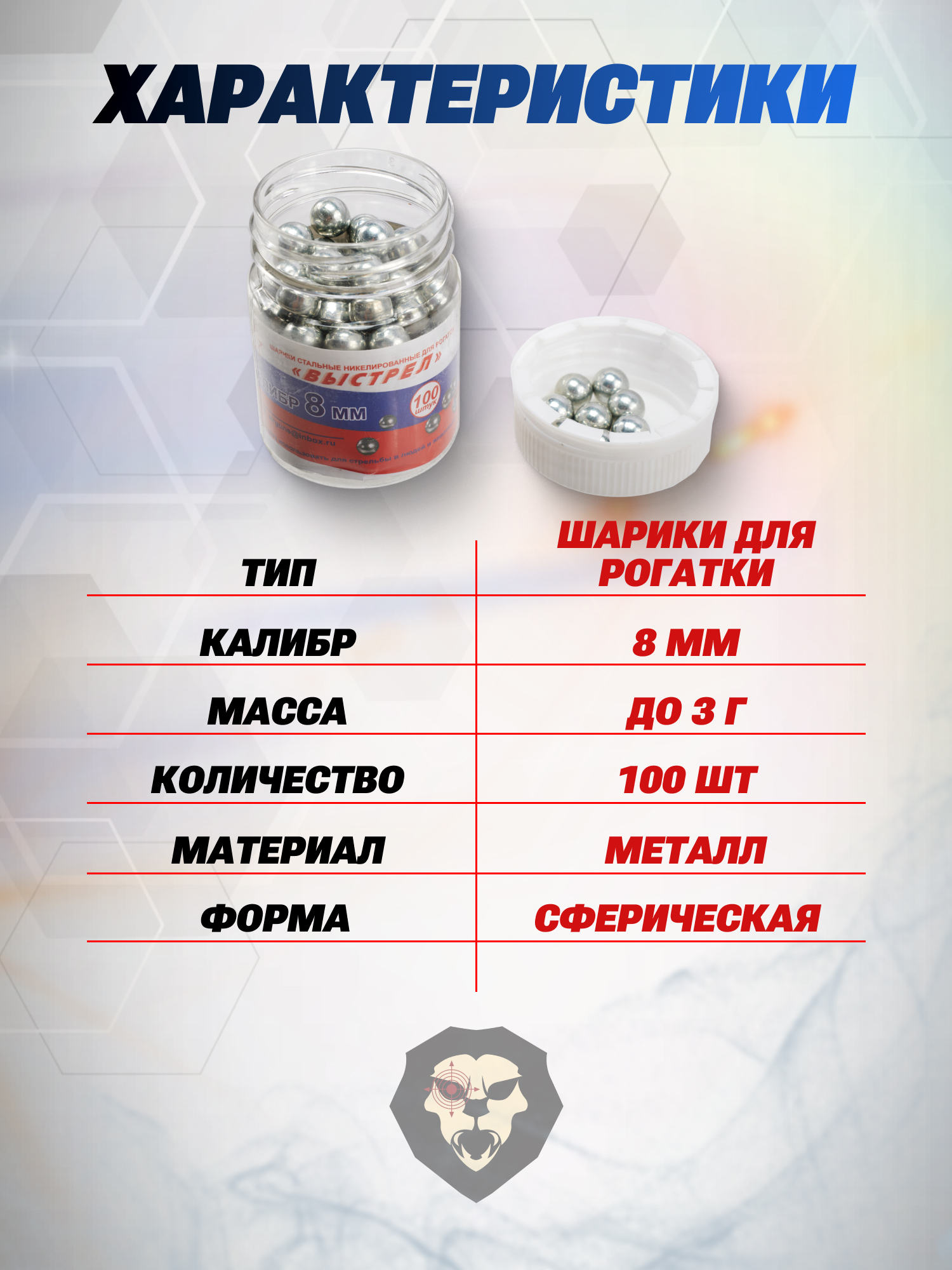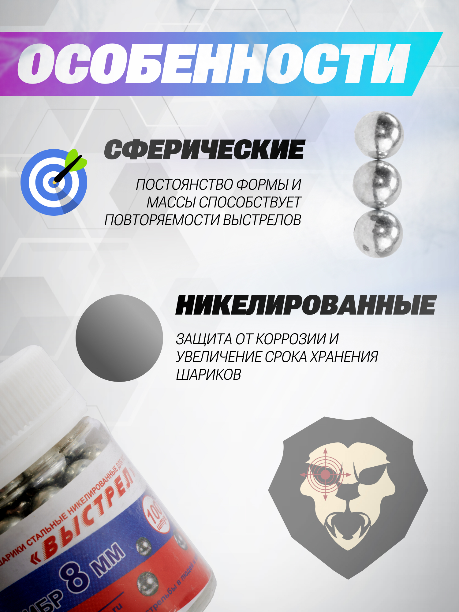 Стальные шарики для рогатки не теряют первоначальную геометрию при попадании в цель в отличие от свинцовых пуль ввиду большей плотности. Поверхность боеприпасов полируют до состояния отражения - последнее исключает присутствие заусенцев и иных дефектов, которые могли бы повредить резиновый жгут или травмировать кожу. Вместе с тем свет, отражаемый от серых шаров Выстрел делает его заметными, что позволит найти их после попадания по мишени.