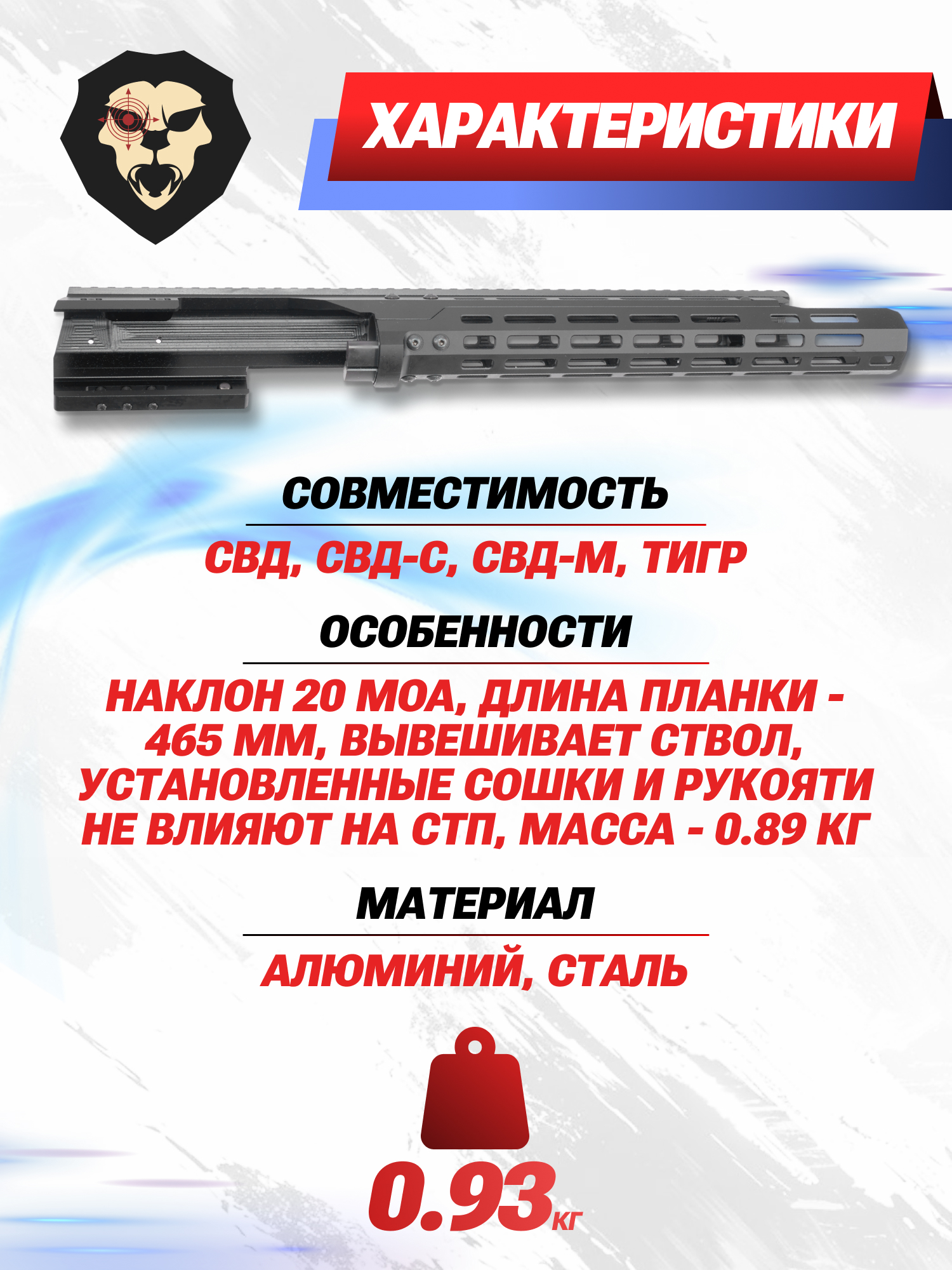 | Особенности | Наклон 20 MOA, длина планки - 465 мм, вывешивает ствол, установленные сошки и рукояти не влияют на СТП, масса - 0.89 кг |