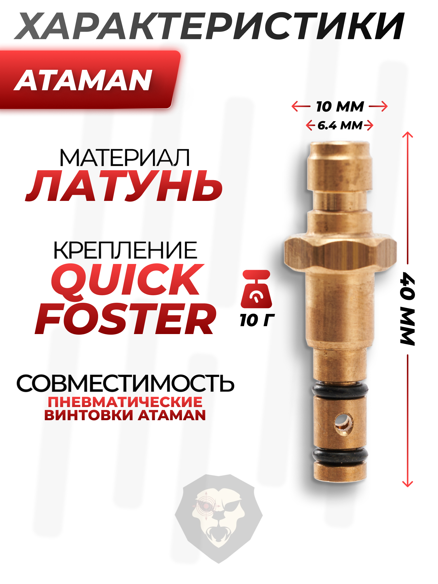 Заправочный штуцер Атаман предназначен для подсоединения к компрессорам и насосным станциям, совместимым с креплением типа Квик-Фостер. Ответная часть вставляется в разъем ресивера пневматики, и выполняется накачка до необходимого значения. После завершения процесса пользователю не потребуется тратить время на выкручивание штуцера - достаточно перекрыть клапан насоса или заправочного механизма, после чего адаптер моментально извлекается из гнезда путем оттягивания фиксатора крепления на себя.