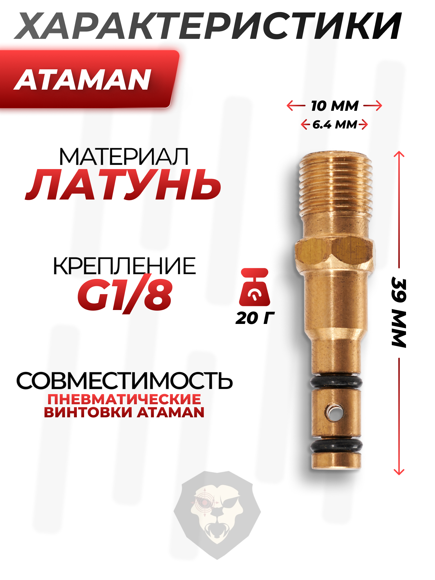 Владельцам пневматики российского бренда Атаман подойдет заправочный штуцер для PCP BH-KFAN с диаметром носика 6.4 мм. Коннектор на 100 процентов изготовлен из латуни, которая относится к изностойким и антикоррозийным металлом и снабжен внешней резьбой типа «папа» Г1/8.