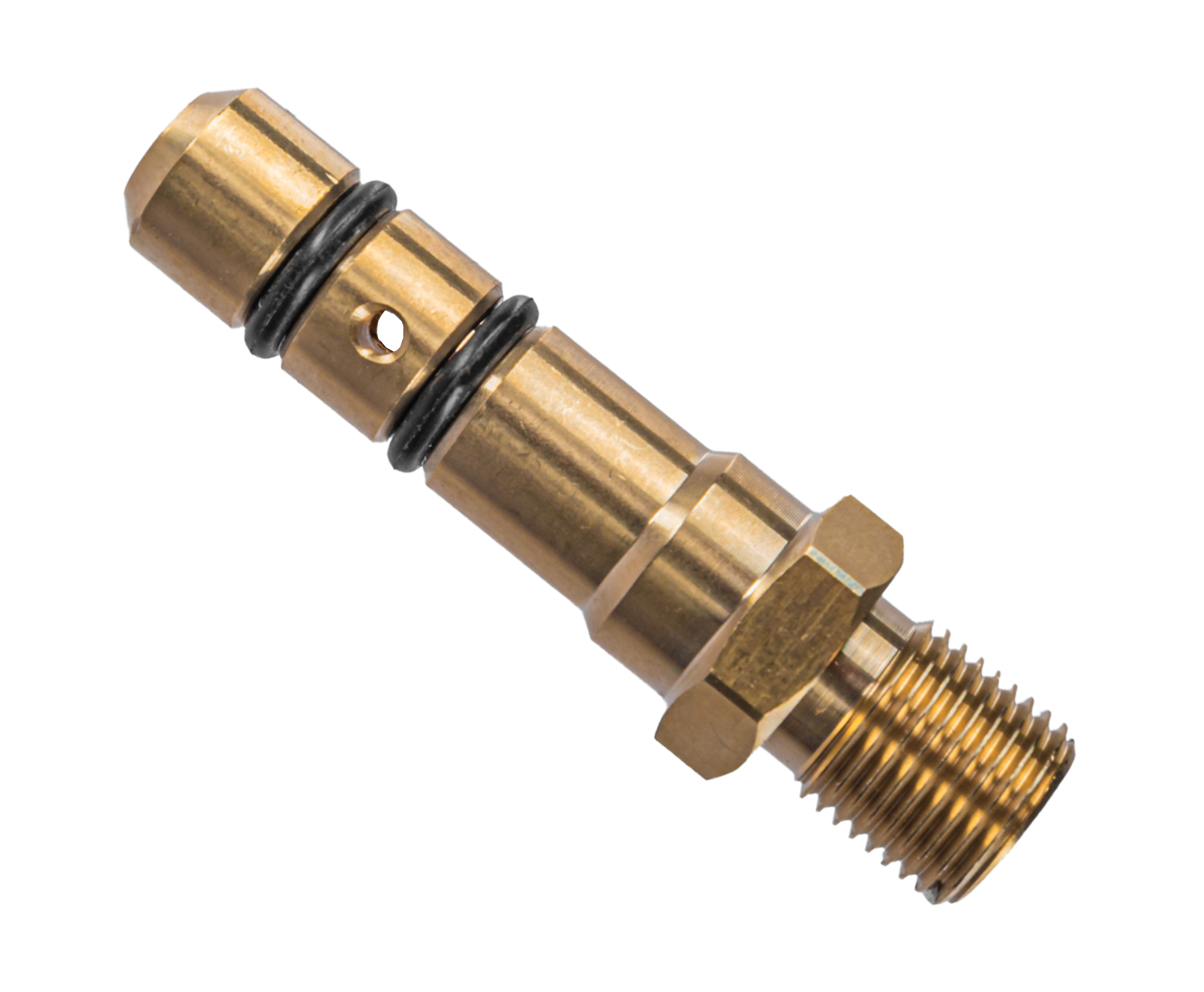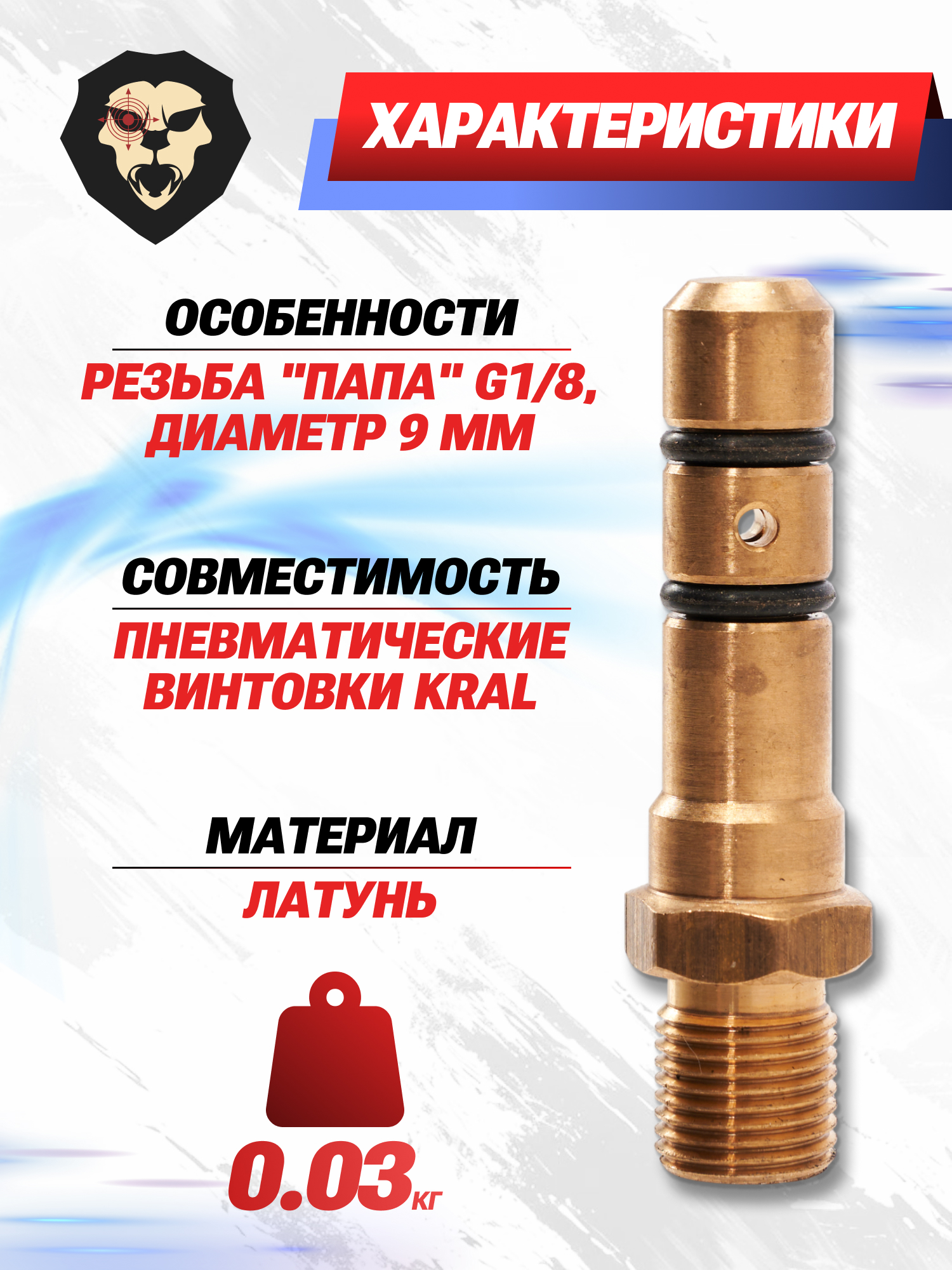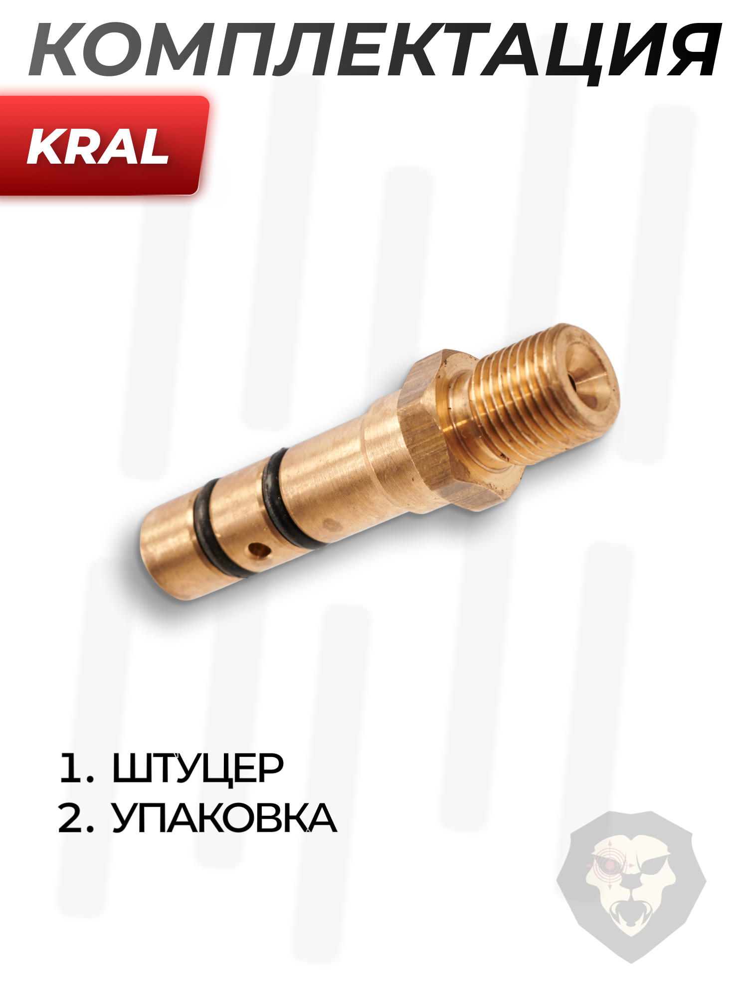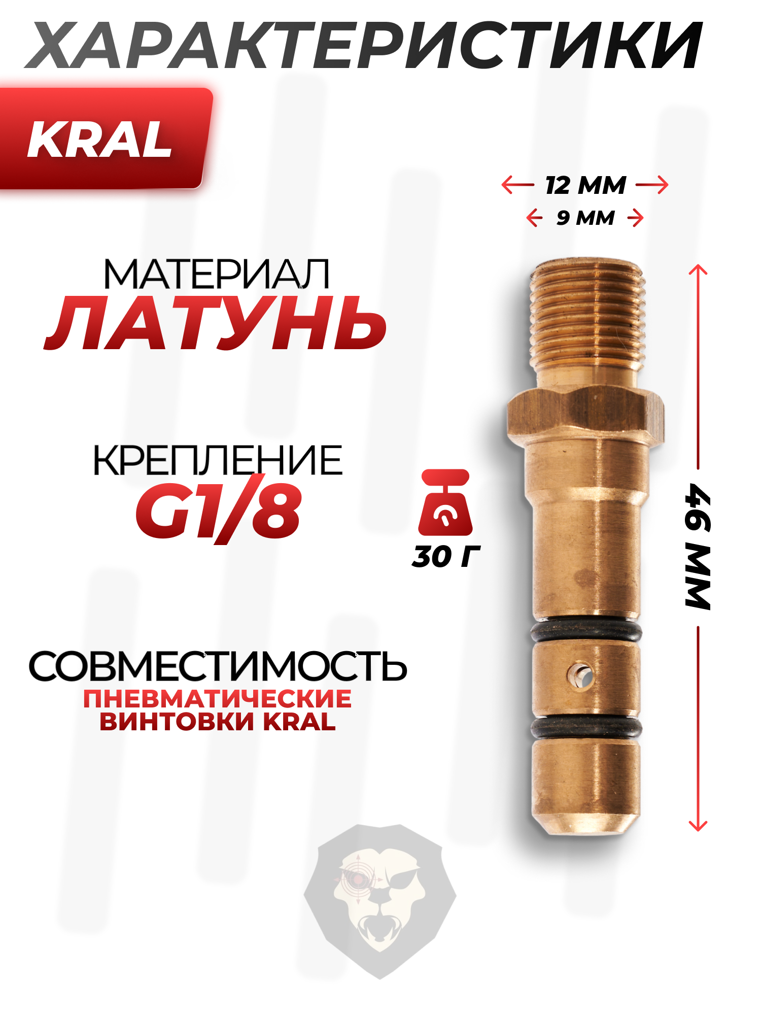 Обозреваемый заправочный штуцер Kral предназначен для пополнения газом пневматических устройств серии Puncher. Адаптер полностью выполнен из латуни - металла, стойкого к возникновению коррозии. Носик штуцера имеет диаметр 9 мм, а для предотвращения потерь воздуха изготовитель предусмотрел наличие двух уплотнительных колец, выполненных из прочной и эластичной резины.