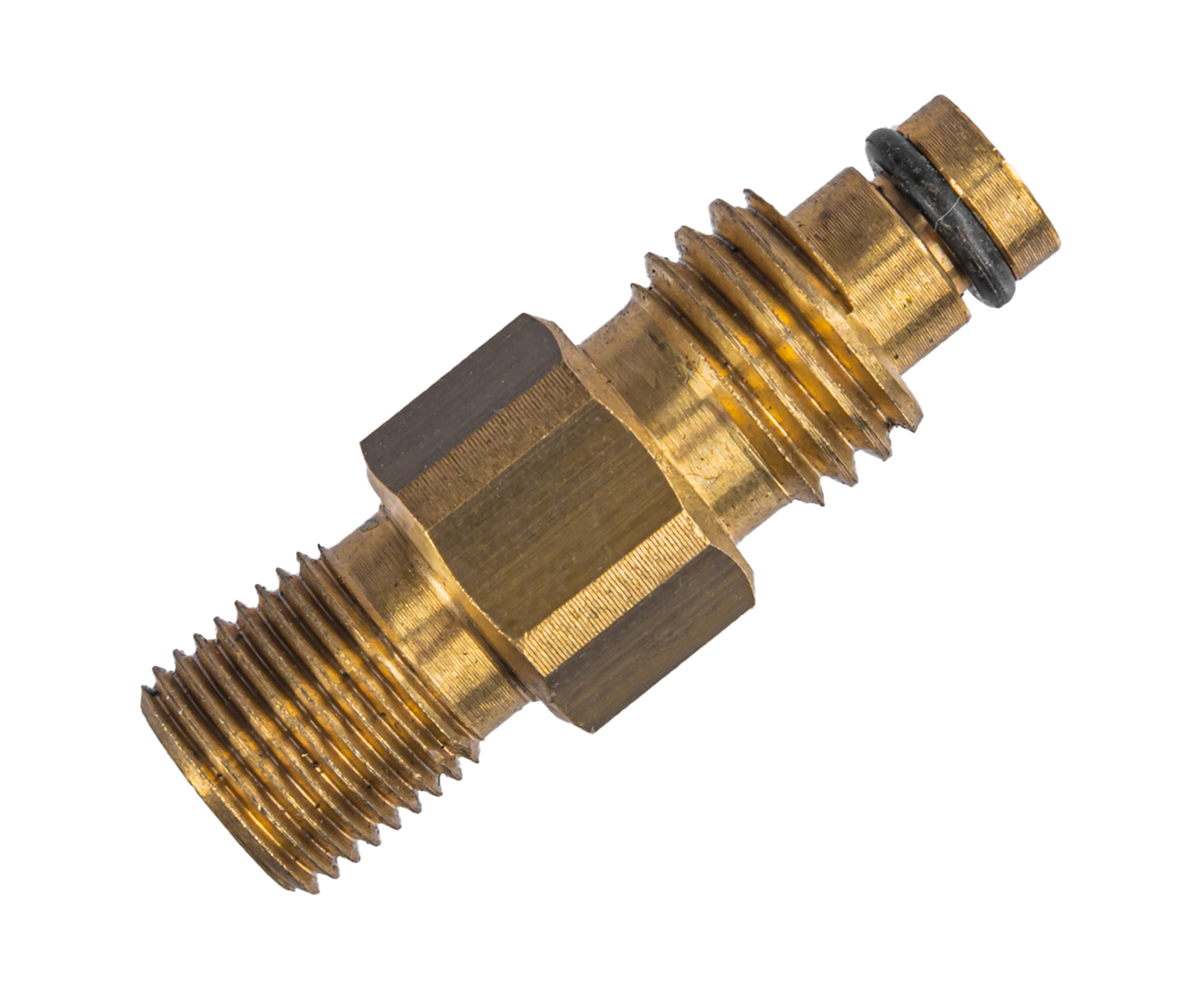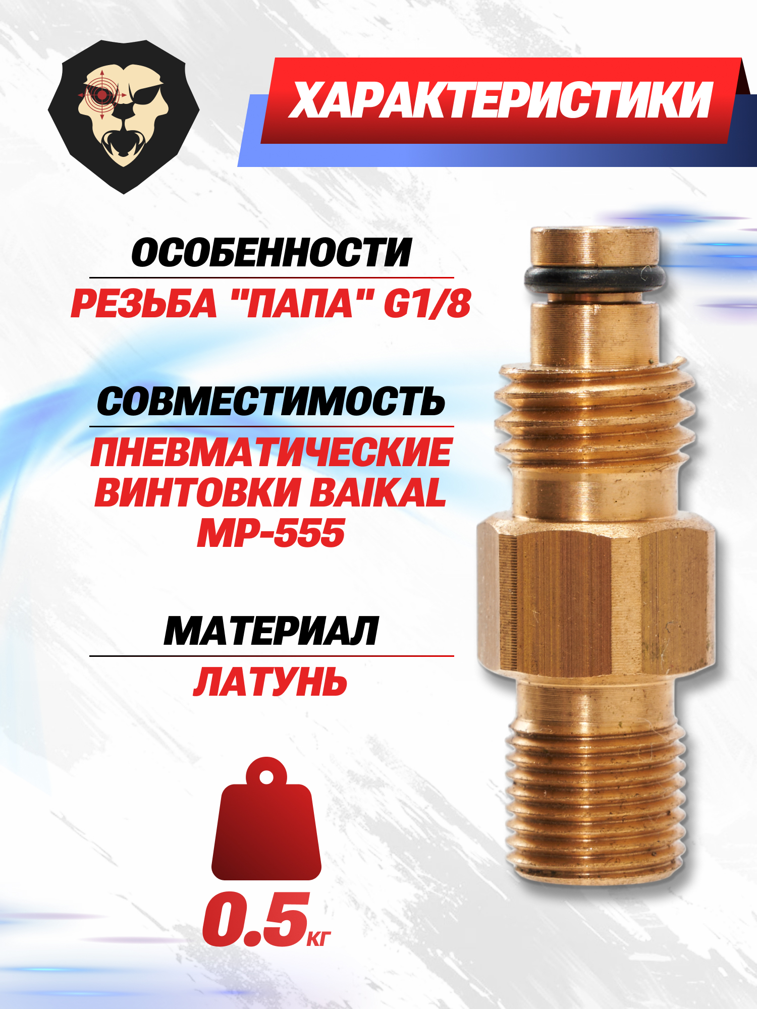Стороной с резьбой типа «папа» G1/8 адаптер вкручивается в источник с запасом газа, а частью с носиком в порт для закачки на ресивере оружия. Коннектор изготовлен из высококачественной латуни и имеет резиновую вставку для надежной герметизации в процессе заправки.