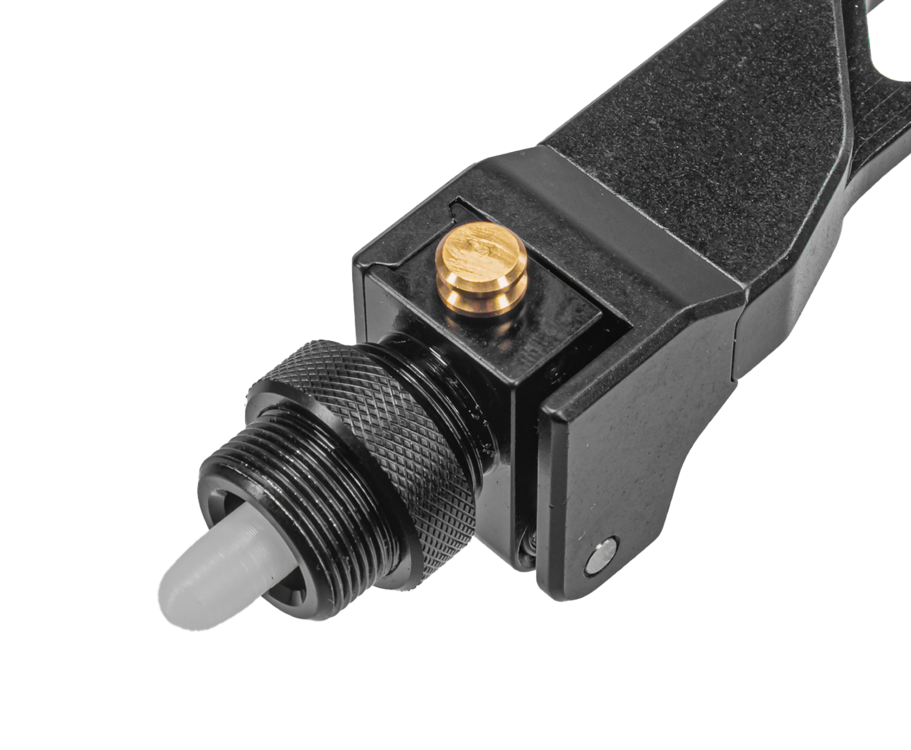 Складной приклад Доберман в разложенном виде увеличивает длину конструкции пневматики на 265 мм. Запирающий механизм надежно фиксирует выбранное положение, изменение которого подразумевает нажатие на соответствующую клавишу в основании замка. В свою очередь ребристый затыльник на подвижном соединении обеспечивает плотную вкладку в рабочем вертикальном состоянии, а в походном - выставляется горизонтально, что дополнительно снижает габарит и не мешает транспортировке.