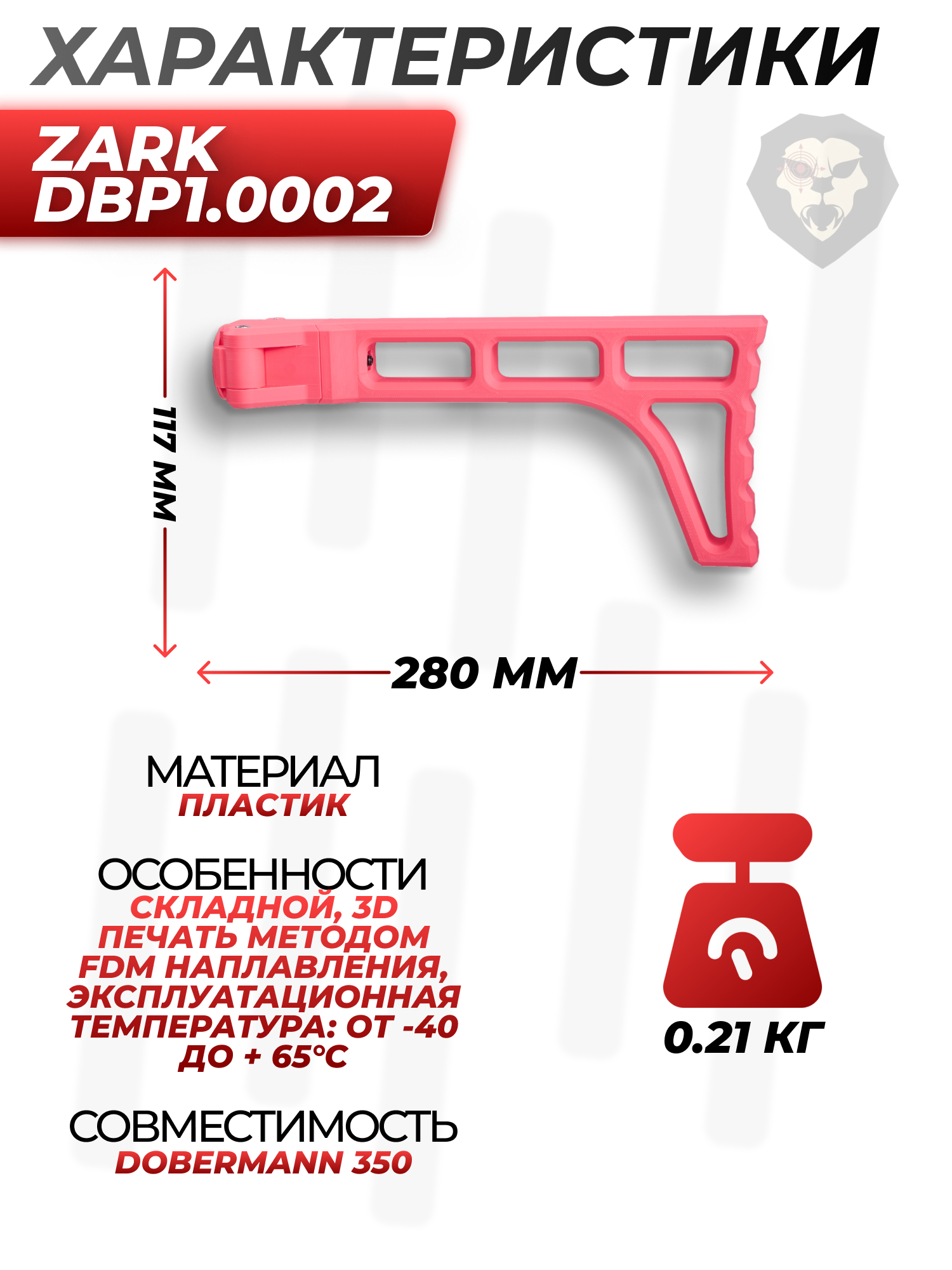 Образец от Zark разработали специально для серии пистолетов Доберман 350. Преимущество этого приклада заключается в складной конструкции - в походном положении длина оружия меняется неощутимо, соответственно удобство транспортировки сохраняется. Еще одним достоинством стала возможность изменения стороны, в которую будет произведено складывание - для этого адаптер переворачивают при сборке.