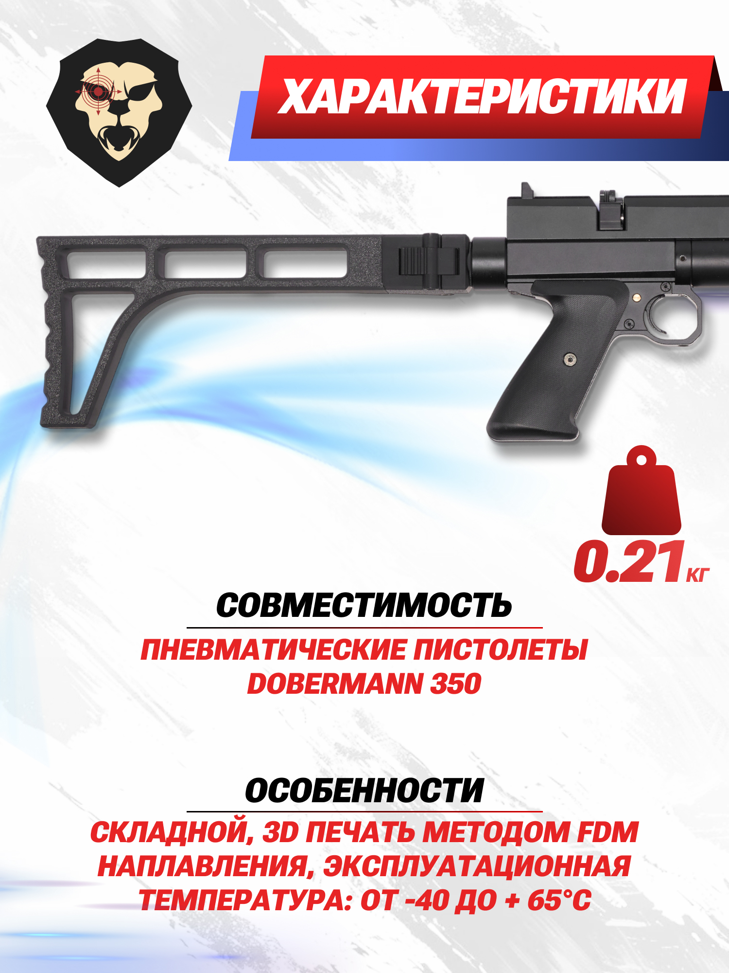 Модель DBP-3 разработана под пневматический пистолет Доберман 350. Фиксация происходит через штатный адаптер - плечевой упор вкручивается в резьбу переходника, при этом важно не допускать перекоса. Для соблюдения соосности и корректного позиционирования в набор входят уплотнительные кольца.