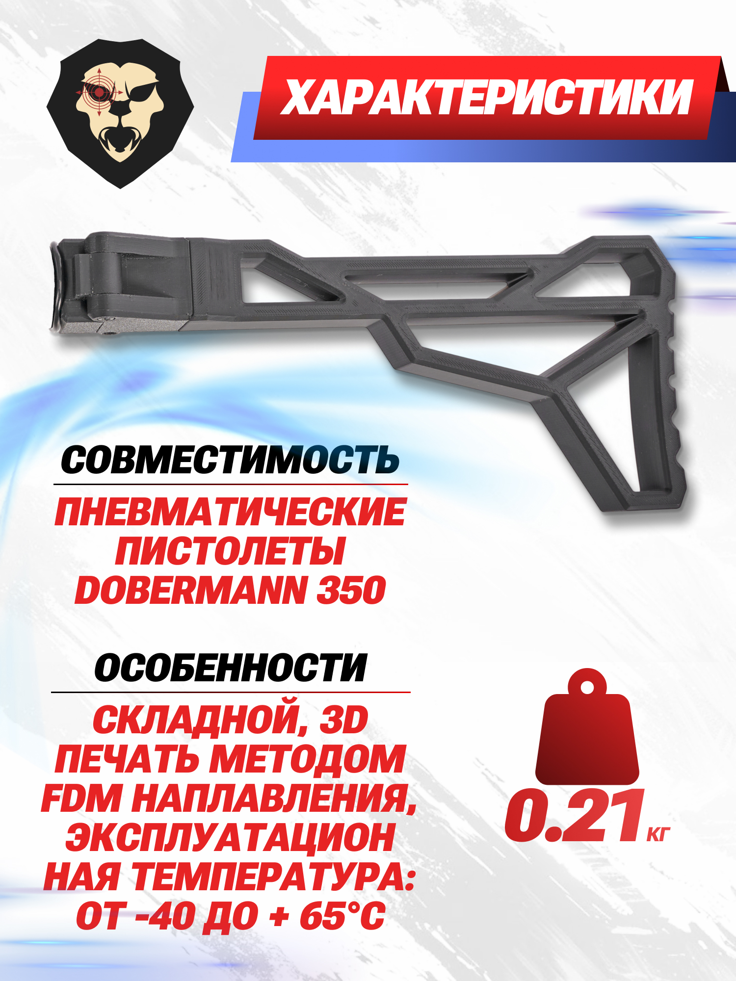 Выполнение складного приклада для пистолета Dobermann осуществляется при помощи специализированного высокоточного оборудования - детали изготавливаются методом послойного наплавления полимерного материала по технологии ФДМ на 3Д-принтере. Такой материал обладает прочностью, а также устойчивостью к холоду до минус 40 градусов и жаре до плюс 65 градусов по Цельсию, что делает его пригодным для эксплуатации в различных условиях.