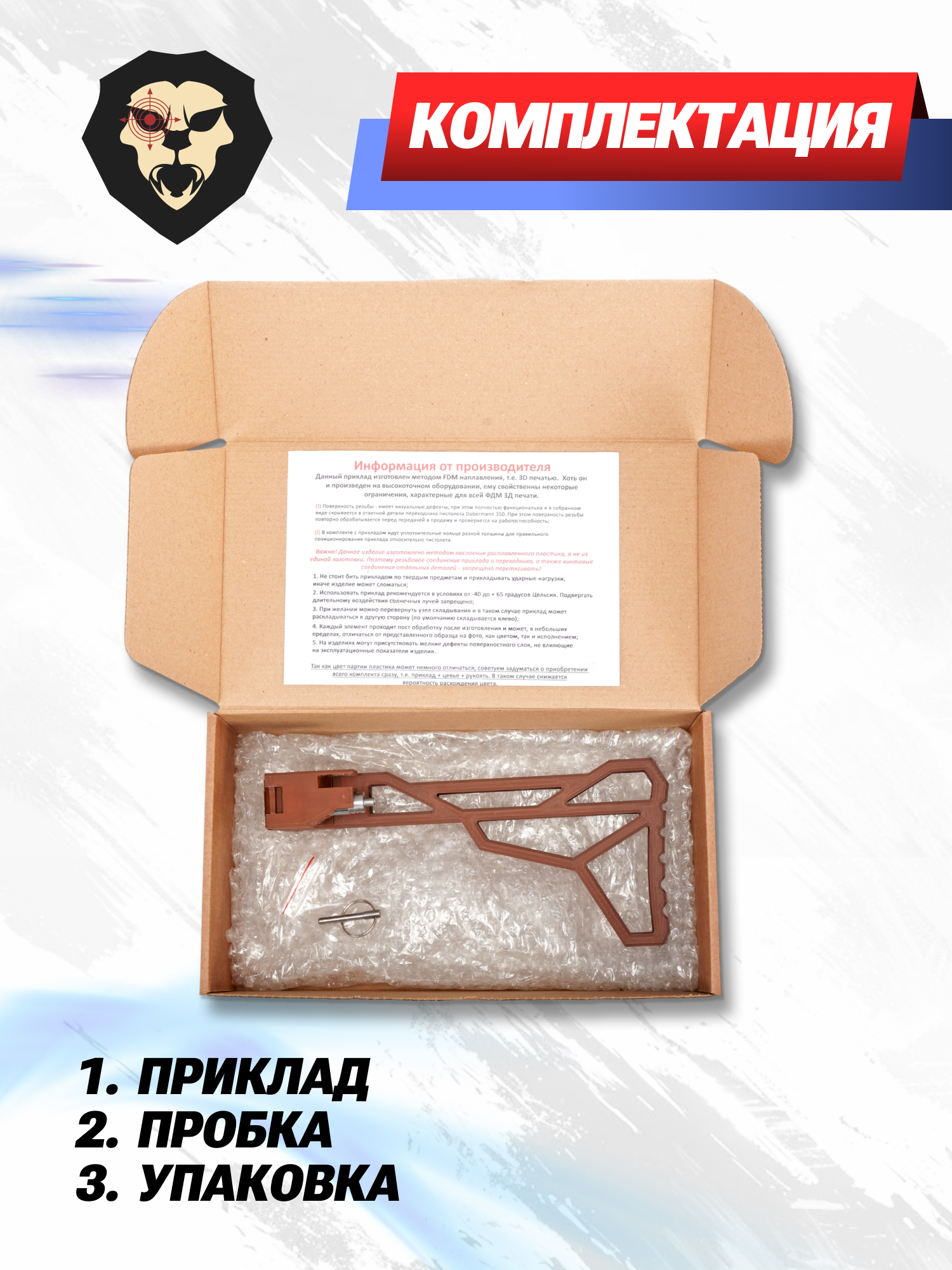 В комплектации с прикладом входят два дополнительных элемента - альтернативная пробка для поджима пружины ударника и специальный «солдатик» для крепления. Для монтажа потребуется инструмент, который не входит в набор поставки - его выбор остается на усмотрение пользователя.