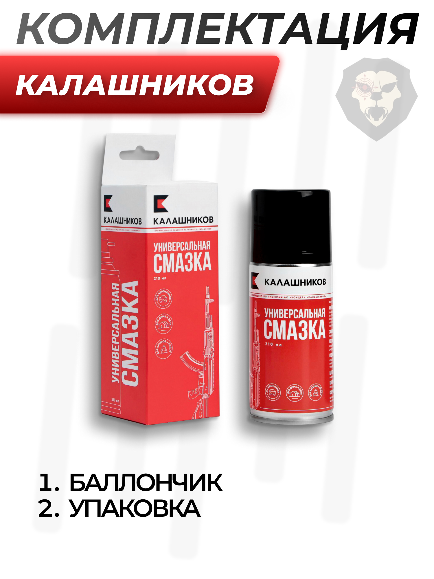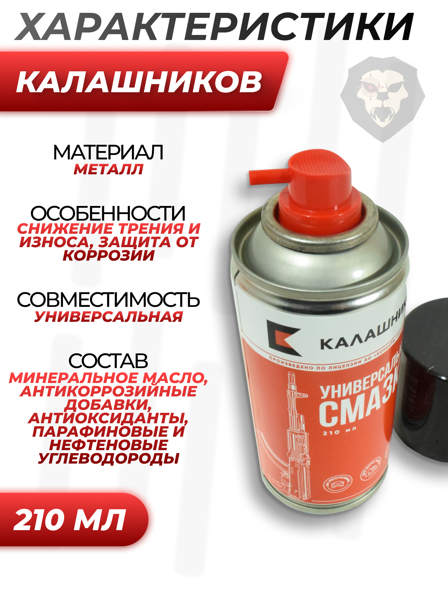 Информация о товаре "Смазка универсальная Калашников (210 мл, аэрозоль)" носит ознакомительный характер, и не является публичной офертой, определяемой положениями Статьи 437 Гражданского кодекса Российской Федерации, характеристики, внешний вид, цвет и комплектация могут быть изменены производителем без уведомления.