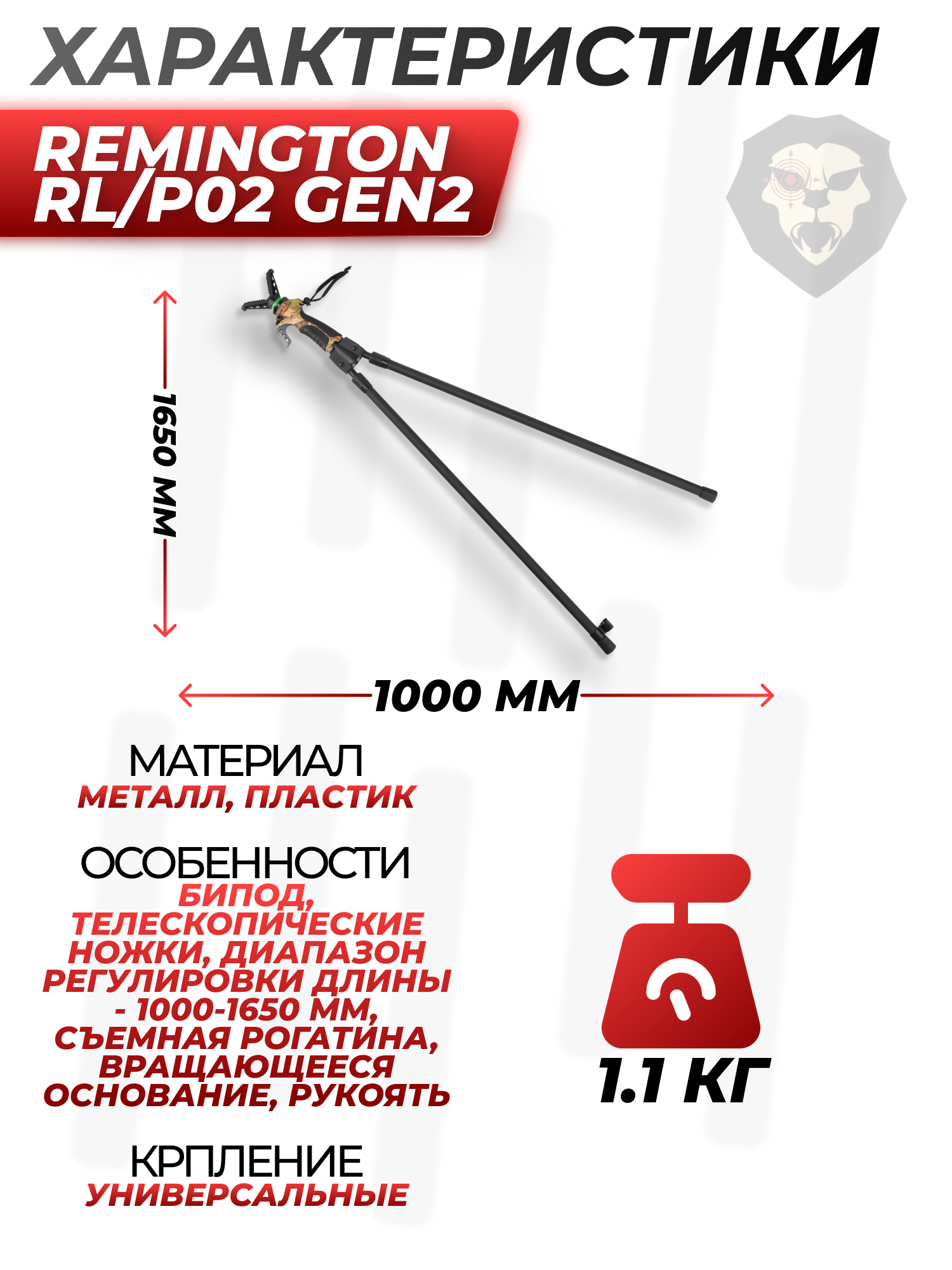 Информация о товаре "Сошка-опора Remington RL/P02 Gen2 (телескопическая, Bipod, 1000-1650 мм, с рукояткой)" носит ознакомительный характер, и не является публичной офертой, определяемой положениями Статьи 437 Гражданского кодекса Российской Федерации, характеристики, внешний вид, цвет и комплектация могут быть изменены производителем без уведомления.