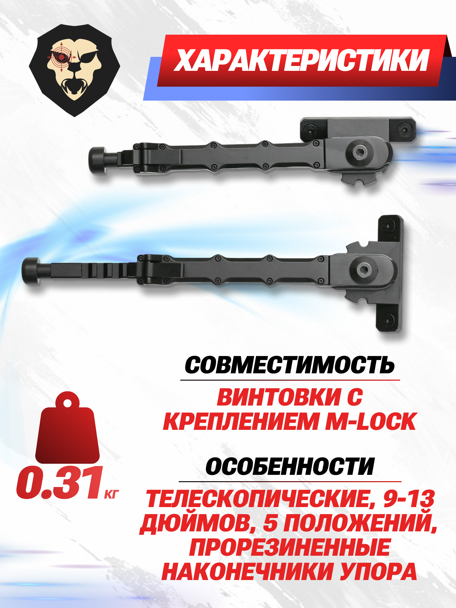 Представленные сошки Patriot BH-BP24 изготавливаются из алюминиевого сплава, характеризующегося легкостью и прочностью. Конструкция изделия подразумевает установку на оружие, содержащее монтажные слоты M-Lok. Подобный способ крепления выделяется простотой и высокой надежностью, так как размещенный упор не начинает люфтить со временем.