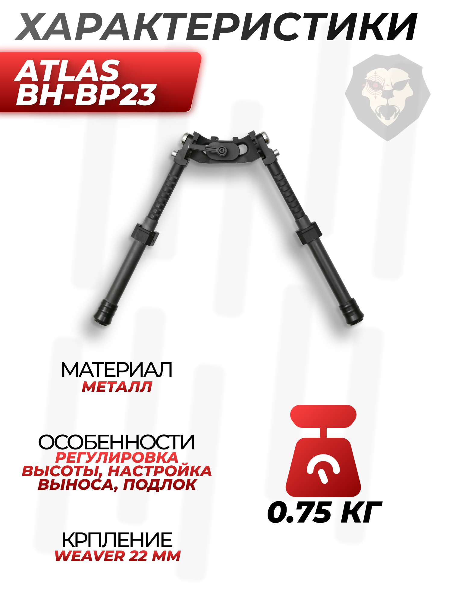 Atlas модели BH-BP23 - сошки для винтовки оснащенной планкой Вивера стандарта 22 миллиметра. Крепежная плоскость подразумевает регулировки горизонтальной оси расположения оружия. Оперативность настройки достигается подлоком.